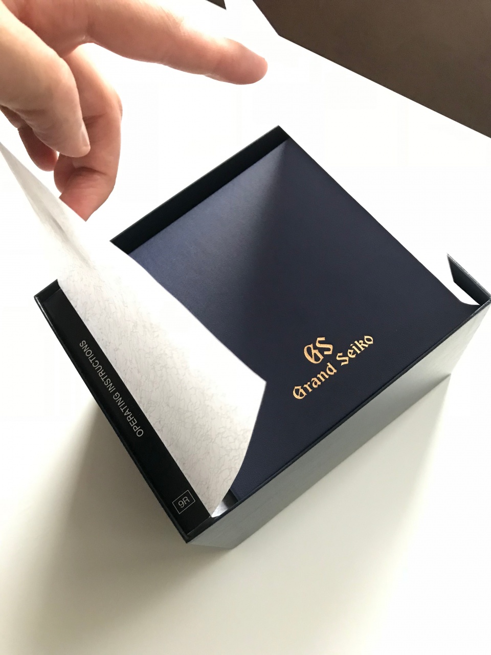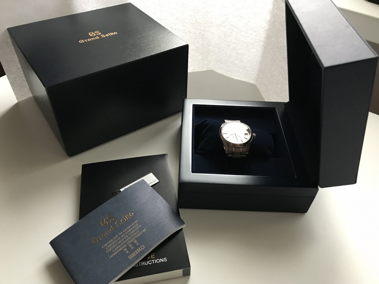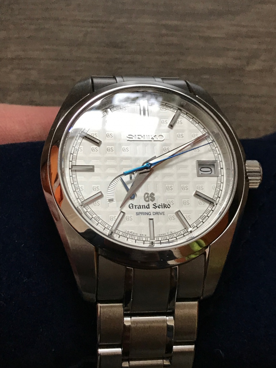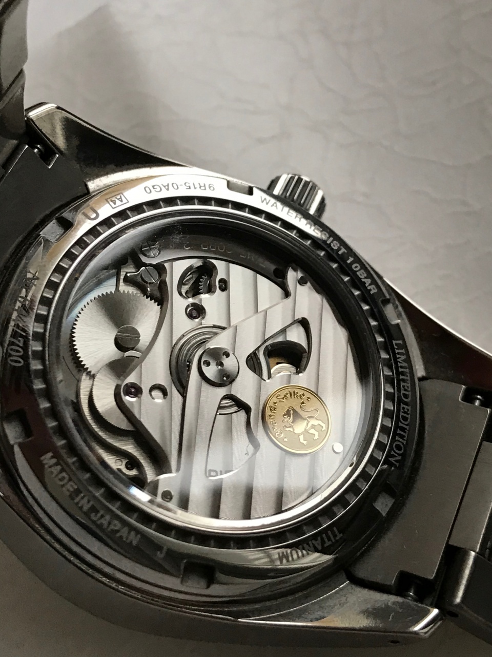 Лёгкий и крепкий титан, белый циферблат "снежок" (White Snow) в особом исполнении - с гильошем с вплетенными лого GS и одним львом - символом марки, синие секундная и запаса хода стрелки. Прозрачная задняя крышка, золотая печатка со львом на маятнике автозавода.