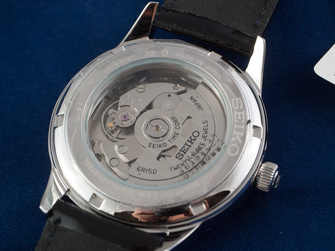 Механизм Seiko 6R15D (последняя модификация), механика с автоподзаводом, с ручным заводом и остановкой секундной стрелки, 3 стрелки, дата
