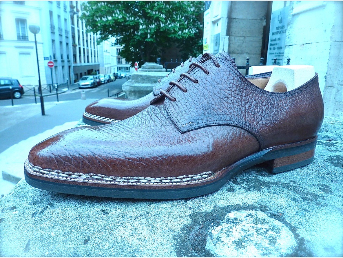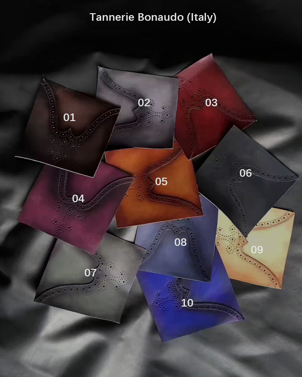 кожу использует banaudo краст под покраску(абсолютно такую же использует Берлути), цвет практически любой на заказ, annonay - французская окрашенная в комментах не нуждается кто хоть немного в теме, hatchgrain от Horween, Weinheimer black box calf, есть темно-серая замша Charles F Stead and Co Ltd. + куча вариантов китайской замши всех цветов. Модель могут сшить любую, колодки - человечьи