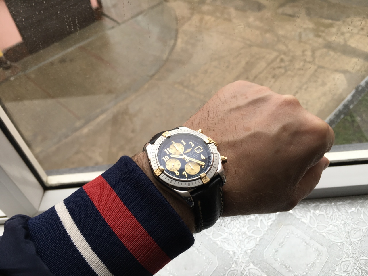 Циферблат - с накладными арабскими цифрами из золота, стрелки - золото, "колодцы" хронографа - золото.