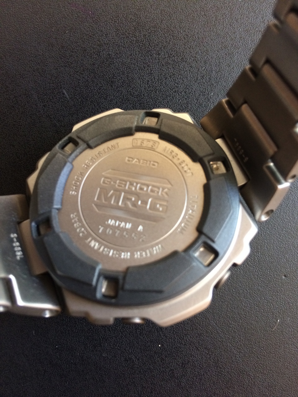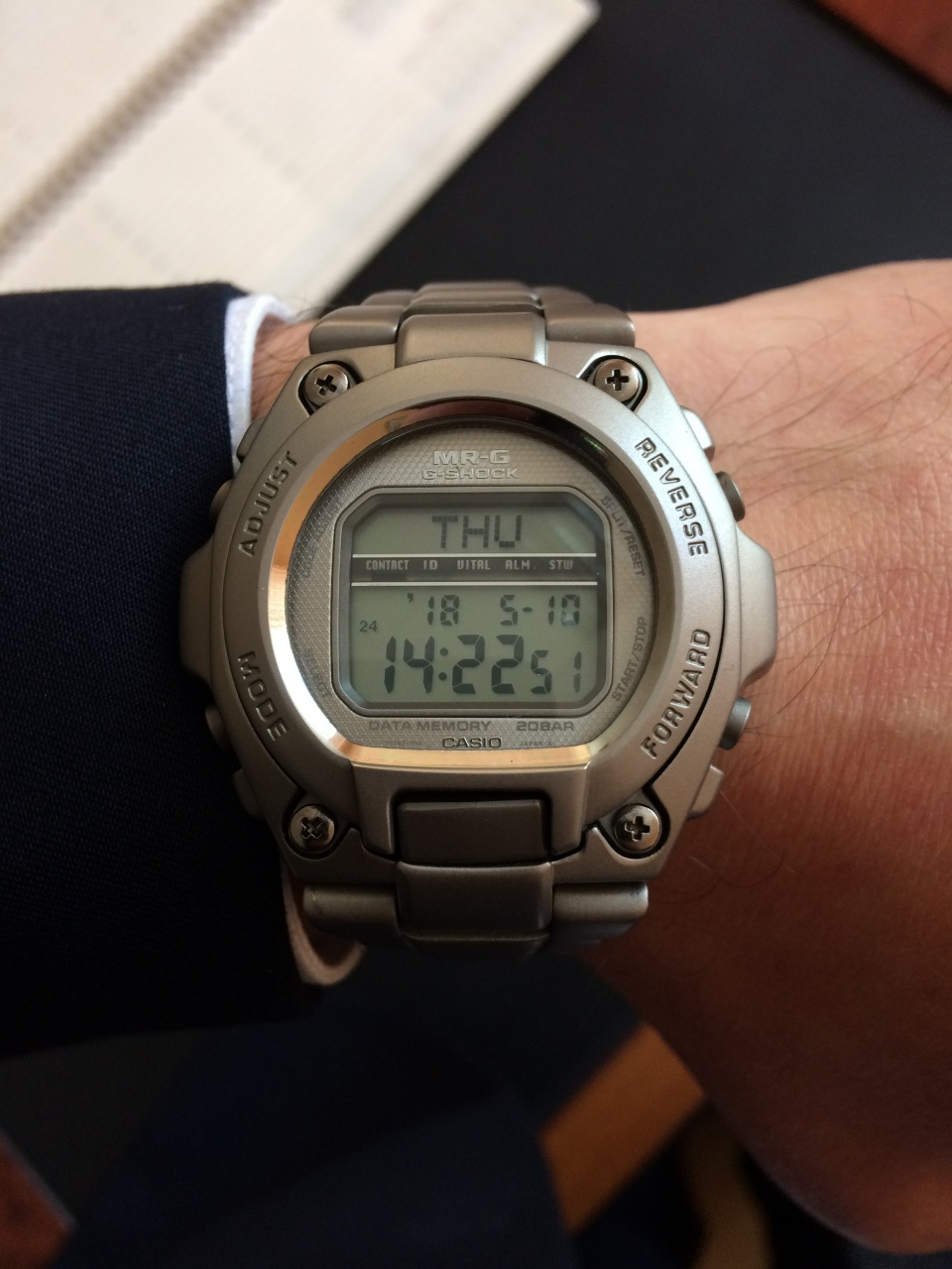 Часы титановые с покрытием из серии MRG. Модель конца 90-х годов. Размера небольшого, что сейчас для Шоков скорее редкость. Браслет немного укоротил, звенья соединены обычными шпильками. На руки сидят удобно (обхват моего запястья примерно 17 см.).