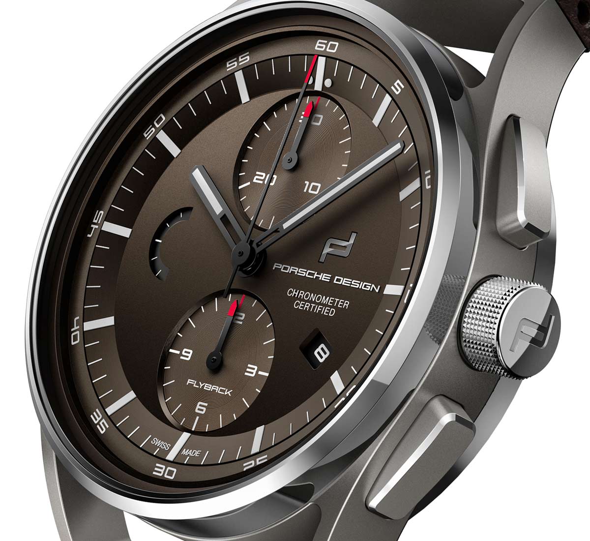 Новинка имеет круглый корпус, изготовленный из титана, диаметром 42,0 мм, толщиной 14,9 мм, водонепроницаемый до 100 метров. На торце завинчивающейся рифленой заводной головки, расположенной на 3 часах, выгравирован логотип бренда Porsche Design. Пушеры хронографа размещены на 2 и 4 часах. Безель тонкий фиксированный. Сапфировое стекло установлено на передней стороне часового корпуса (выпуклое, с двусторонним антибликовым покрытием) и на его завинчивающейся задней крышке. Циферблат коричневого цвета, с часовыми индексами, часовой и минутной стрелками, покрытыми белым люминесцентным составом. Наконечники стрелок хронографа - контрастного красного цвета. На фланце расположена секундная шкала. Модель оснащена автоматическим механизмом Werk 01.200, с балансовой частотой 28800 полуколебаний в час (4 гц), 48-часовым запасом хода, вольфрамовым ротором автоподзавода, официально сертифицированным COSC (Contrôle Officiel Suisse des Chronomètres) в качестве хронометра, с функциями индикации часов, минут (посредством соответствующих центральных стрелок), даты (посредством соответствующего цифрового указателя в прямоугольной апертуре, расположенной на 4 часах), с указателем хода калибра (в полукруглой апертуре, расположенной на 9 часах), а также с Flyback-хронографом (центральная секундная стрелка, круглый аналоговый 30-минутный счетчик, расположенный на 12 часах и круглый аналоговый 12-часовый счетчик, расположенный на 6 часах).