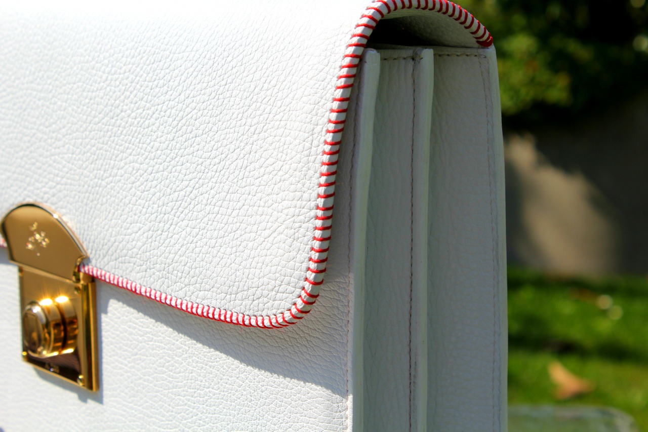 Портфель имеет декоративную прошивку нитью красного цвета, выполненную вручную, что особенно эффектно смотрится на белом фоне портфеля.