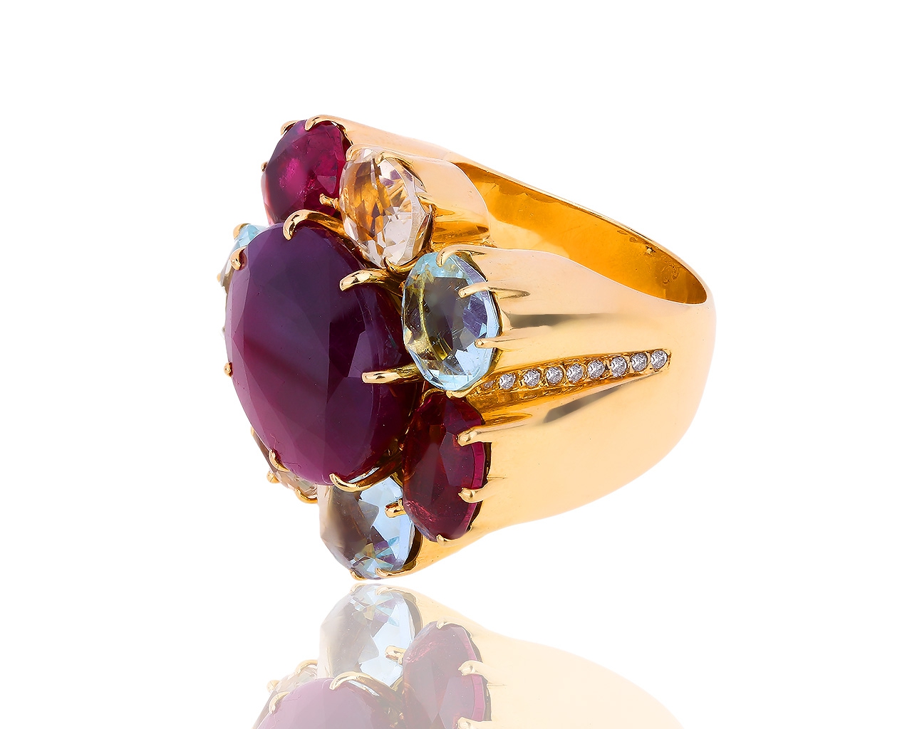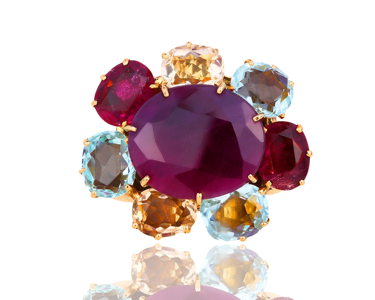 Представляем вашему вниманию волшебное массивное золотое кольцо с рубином 12.66ct, турмалинами 5.25ct, аквамаринами, цитринами и бриллиантами 0.40ct от всемирно известного бренда H.Stern из коллекции Diane Von Furstenberg Harmony.