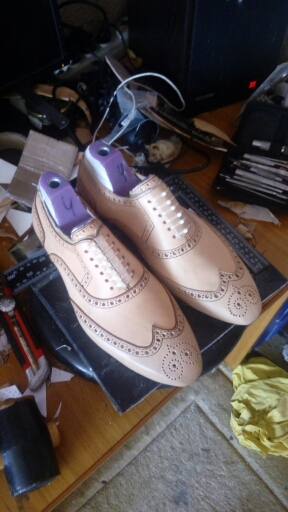 19. Ставим подносок и пятку, прихватываем гвоздями и хорошенько растягиваем и фиксируем гвоздями, немного подсушиваем и остервенело околачиваем чтобы кожа уплотнилась по максимуму, окончательно сушим и ещё всё хорошенько обстукиваем. После шкурим всё, придаём носу желаемую форму и сглаживаем переходы, чтобы пальцем не ощущался стык подноска и задника с подкладом. Не обязательная операция, но я делаю, между подноском и задником приклеиваем кусочек не тянущейся ткани, шириной около 25 мм, так называемые "бочки", исключают деформацию обуви при длительной носке.