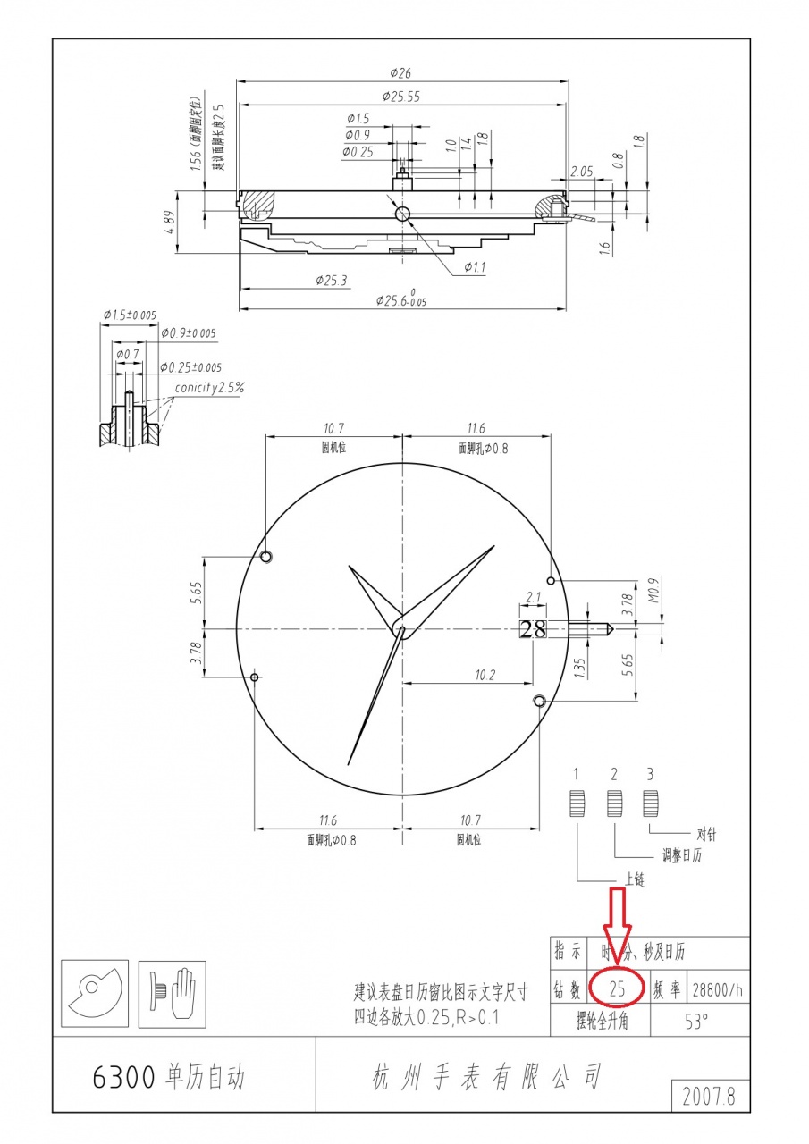 калибр Hangzhou 6300 имеет: диаметр 26 мм, высота с подшипником 4,89 мм: