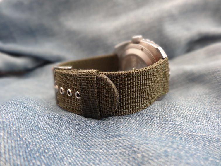 по материалу он неплох - нейлон как нейлон, даже переливается на свету, веселенький, чуть жестче чем НАТО т.к. двуслойный. но на руке никакого дискомфорта не вызывает. а вот кольца застежки так себе - матовые и какие то на вид неопрятные - я их заполировывал. за ту цену, что за них просят им можно простить все