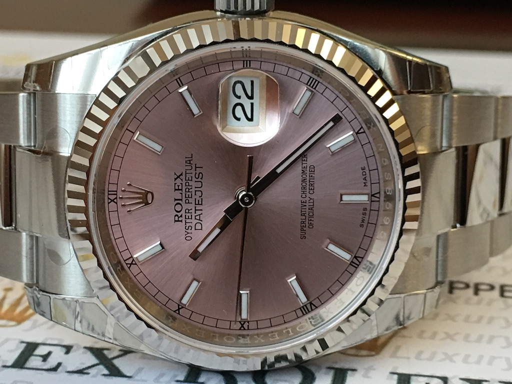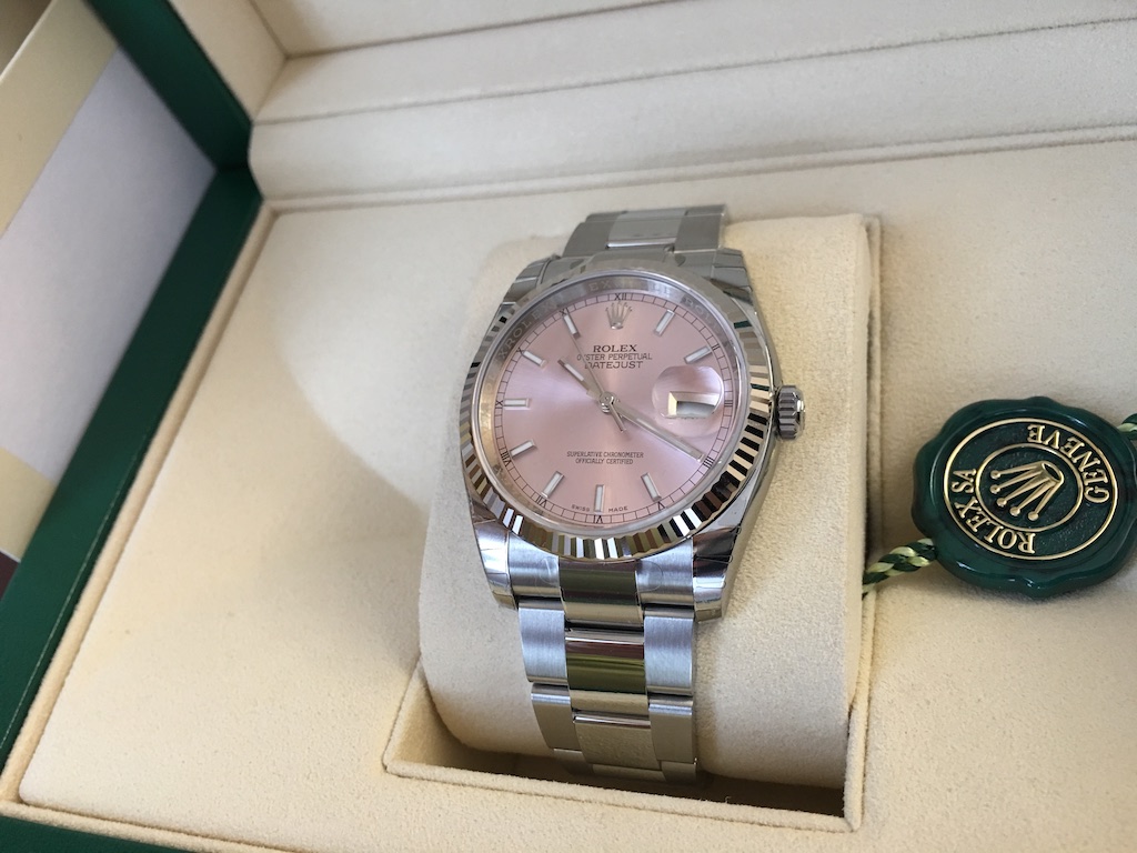 Вниманию уважаемого сообщества предлагается стальной Rolex Datejust с практичным ребристым безелем из белого золота на браслете Oyster, являющийся воплощением женственности и хорошего вкуса. Модель диаметром 36 мм с красивейшим циферблатом розового цвета с золотыми часовыми метками.
