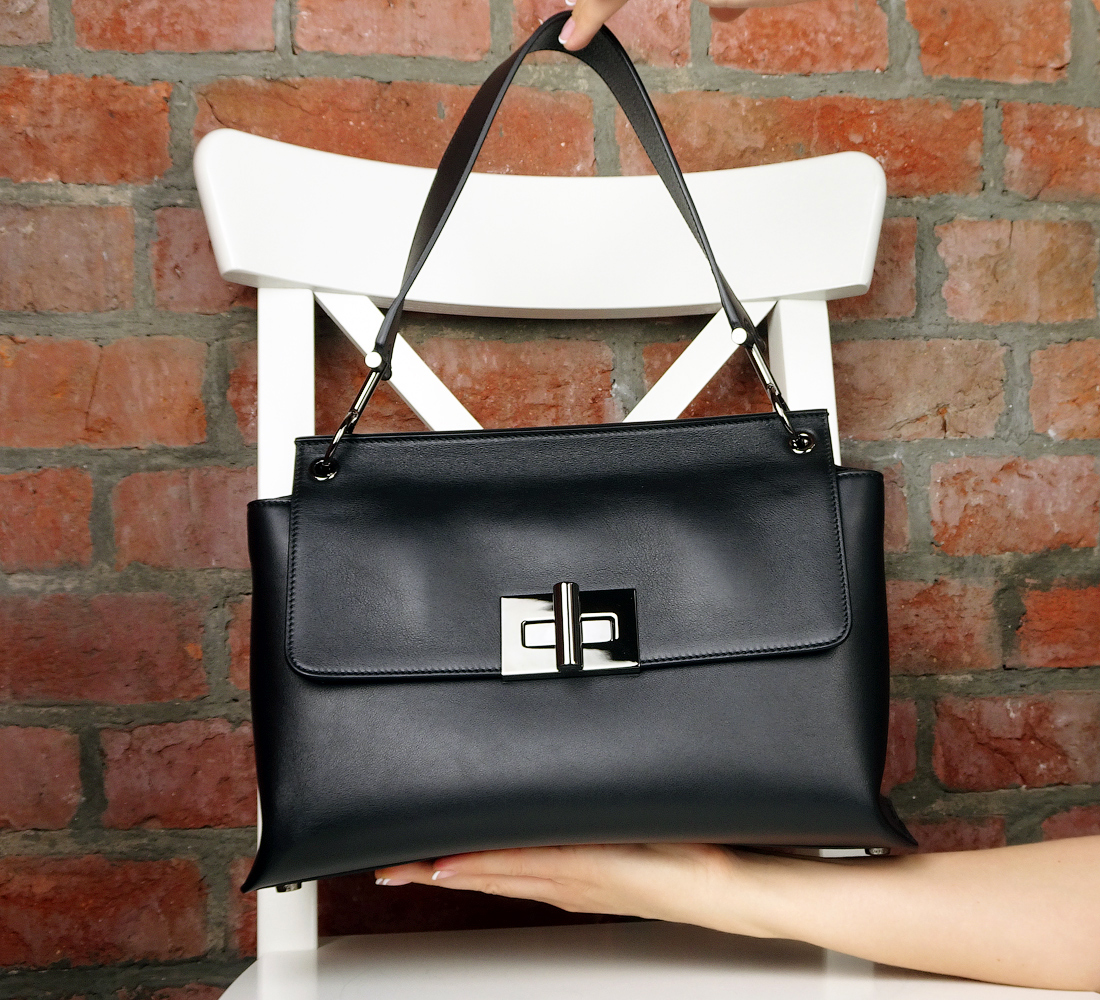 Особенность модели - сумка исполнена в стилистике "all black": черная кожа и черная глянцевая фурнитура.