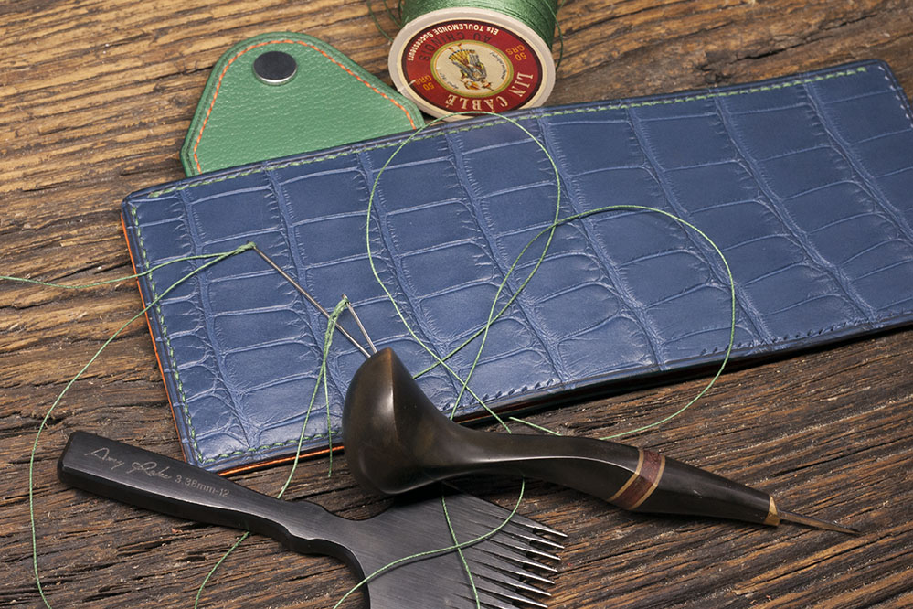 Кошелек прошит полностью вручную с использованием шила для создания особого шва.