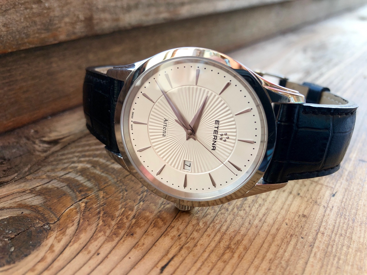 Продам прекрасный костюмник от гиганта часовой индустрии швейцарской корпорации ETERNA.Модель ETERNA Artena,очень красиво выполнено радиальное гильоше с увеличением от центра,все метки и точки циферблата накладные с родиевым покрытием,купольное сапфировое стекло с отличным антибликом,корпус с комбинацией сатина и полировки,на запястье смотрятся престижно и дорого.Часы номерные,практически новые,на гарантии,были куплены в КОНСУЛе 27.04.2018г.Одевались пару раз "на выход".На полном комплекте с инструкцией и карточкой.В январе 2019 была замена батарейки по гарантии тоже в КОНСУЛе."АА" из-за потертости на одном ушке.Обмен не интересен,пересыл только по предоплате на карту Сбера и за счёт покупателя.