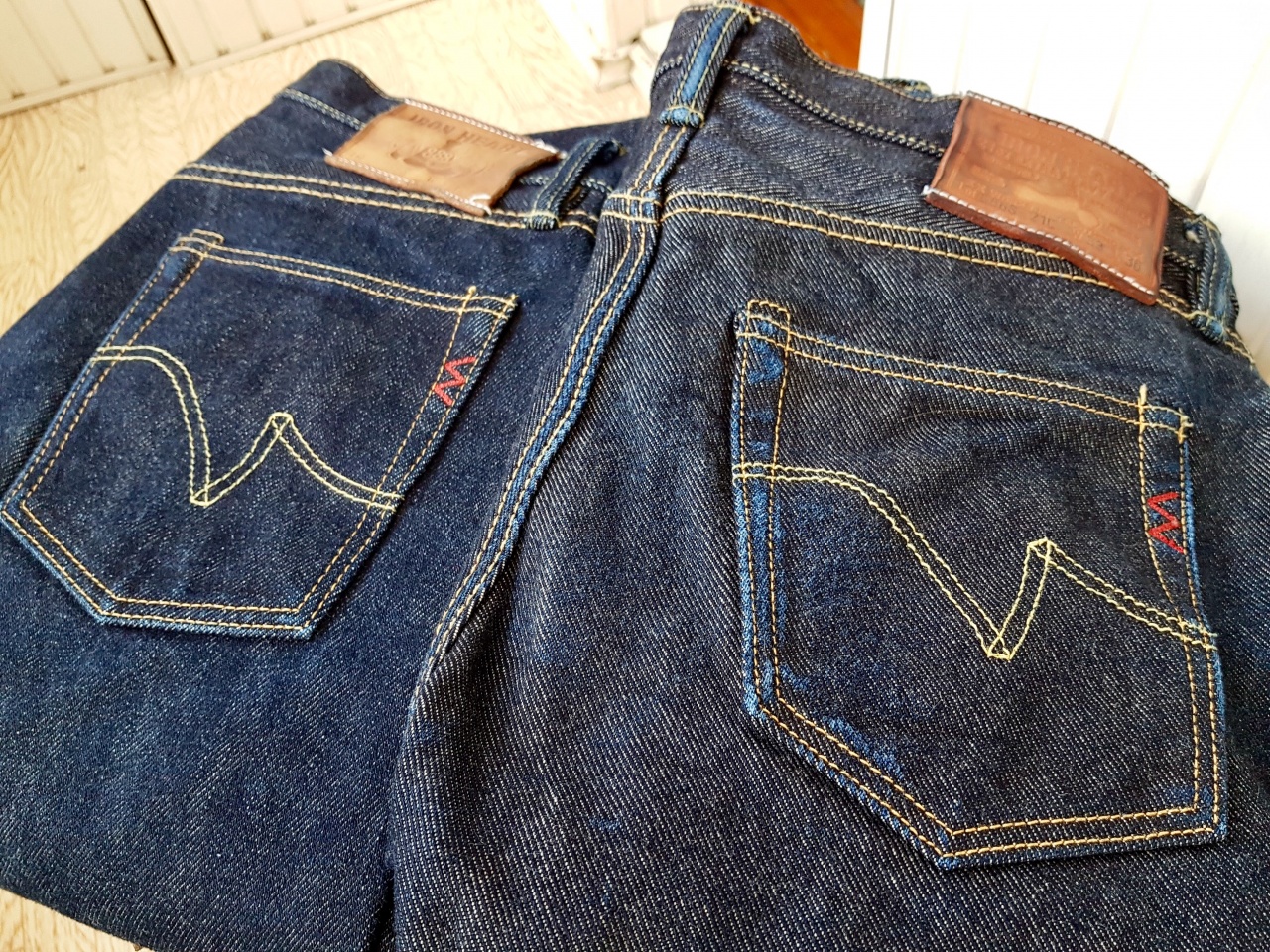 Касательно цвета ....после стирки , к сожалению , изначально серый стальной оттенок основы особо не двинулся в сторону синего ....разве что , совсем немного , даю сравнительные фотки с 21 унцовым правосторонним :