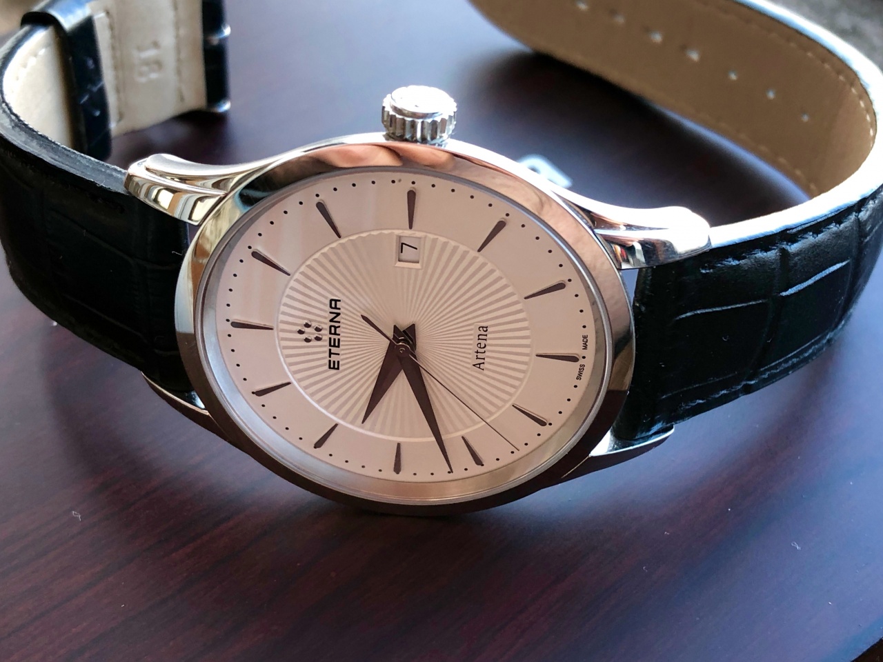 Продам прекрасный костюмник от гиганта часовой индустрии швейцарской корпорации ETERNA.Модель ETERNA Artena,очень красиво выполнено радиальное гильоше с увеличением от центра,все метки и точки циферблата накладные с родиевым покрытием,купольное сапфировое стекло с отличным антибликом,корпус с комбинацией сатина и полировки,на запястье смотрятся престижно и дорого.Часы номерные,практически новые,на гарантии,были куплены в КОНСУЛе 27.04.2018г.Одевались пару раз "на выход".На полном комплекте с инструкцией и карточкой.В январе 2019 была замена батарейки по гарантии тоже в КОНСУЛе."АА" из-за потертости на одном ушке.Обмен не интересен,пересыл только по предоплате на карту Сбера и за счёт покупателя.