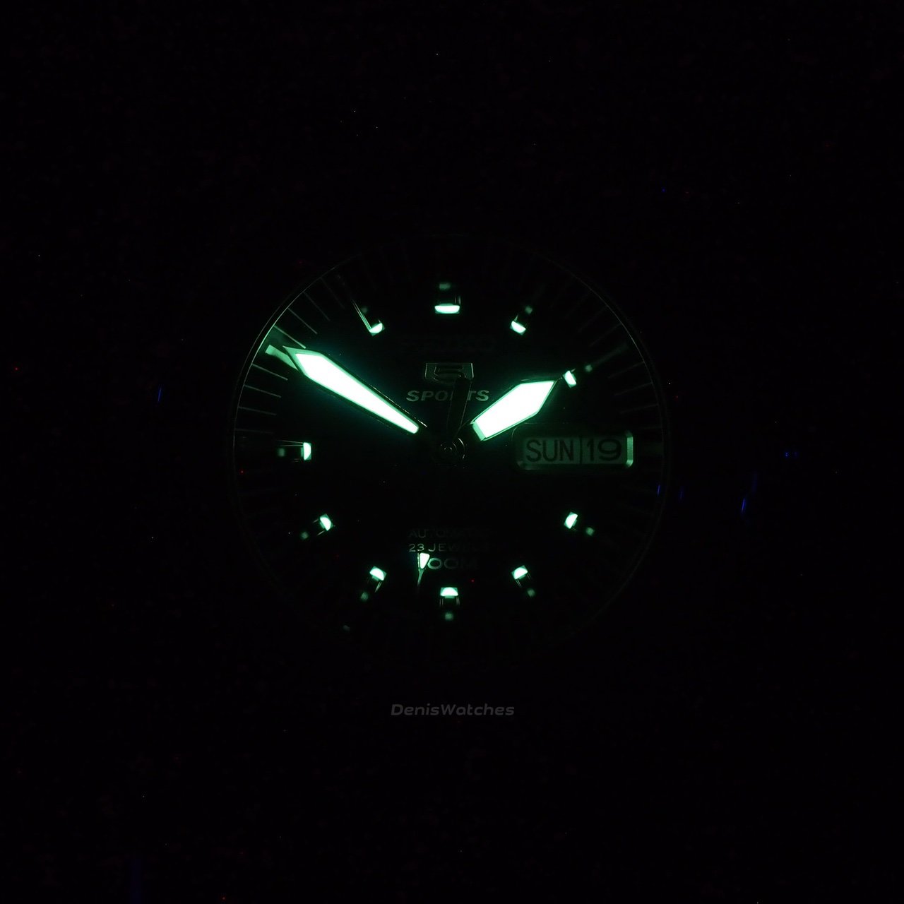 Черный циферблат, накладные метки, окантовка даты и лого Seiko 5