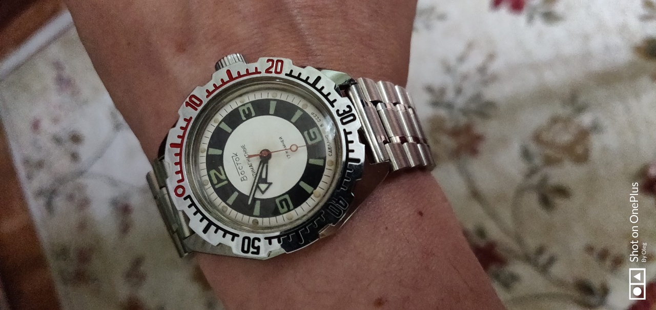 P.S. Кстати, на фото у человека как раз двое часов: амфибия стальная с латунным безелем и полностью латунные командирские. Человек просто ободрал с латуни хромовое покрытие, заменил у командирских циферблат и поменял местами безели.