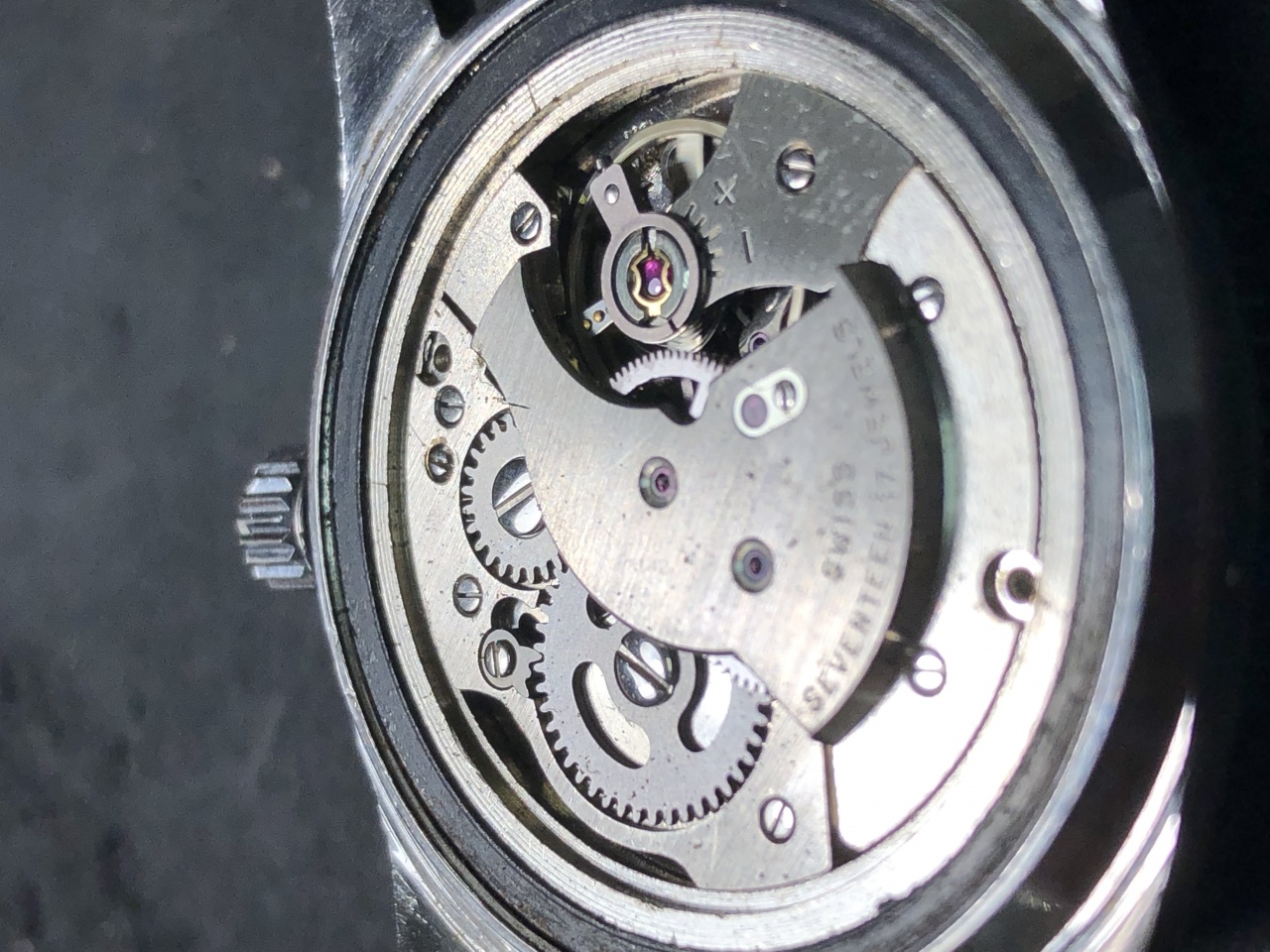 Кстати, неплохой механизм для данного дайвера. Брэнд не примечательный, "один из" выпускавших дайверы и псевдодайверы в те непростые времена. Было бы привычней увидеть тут более простой и дешевый механизм: EB или BFG. В данном случае механизм лучше. Вероятно, часы из 60х, а не 70х.