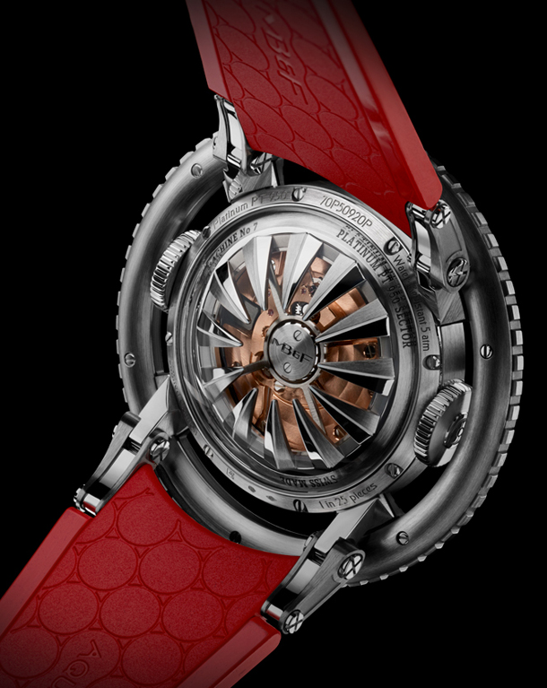Установленный в часах HM7 Platinum Red автоматический механизм, насчитывающий 391 деталь, полностью разработан силами MB&F. Модель HM7 Platinum Red с платиновыми корпусом, безелем и застежкой выпускается ограниченной серией из 25 экземпляров. К каждому экземпляру прилагается три сменных ремешка (красного, белого и черного цвета) из авиационного каучука.