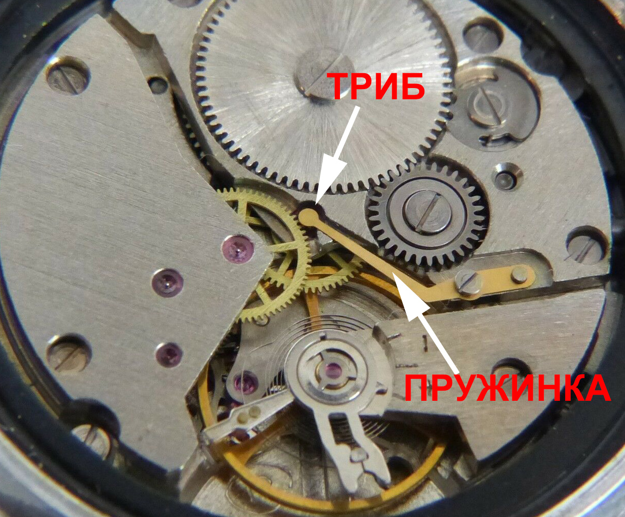стрелка насажена на секундном трибе. это такая шестереночка. с одной стороны - стрелка на оси, с другой - триб.