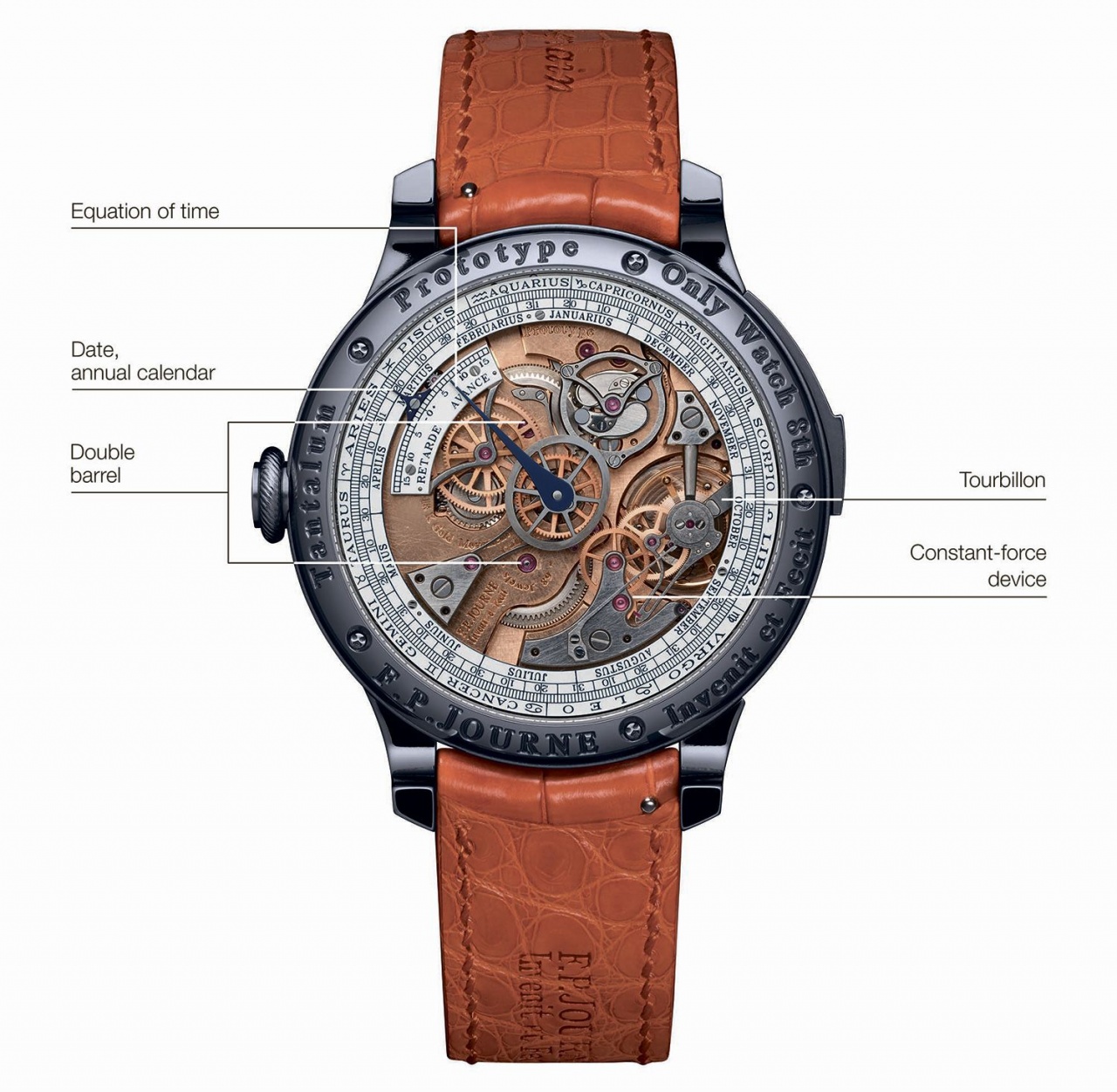 Изделие, существующее на данный момент в качестве прототипа, использует опробованный по прошлым уникальным моделям Only Watch подход — танталовый корпус (диаметр — 44 мм, толщина — 13.75 мм) сочетается с зеркальным циферблатом фирменного темно-синего оттенка Blue chrome и оранжевым ремешком из кожи аллигатора.
