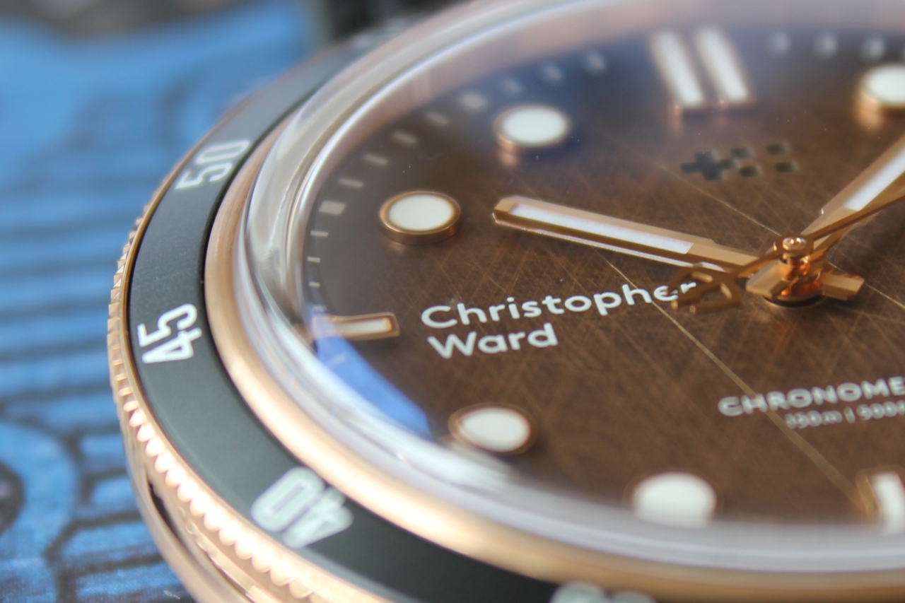 «Твинфлаг» — логотип, символизирующий швейцарский и английский флаги, расположился по центру на 12 часах, текстовое лого «Christopher Ward» — слева на 9-и. Указатель даты — в апертуре, на 3 часах (цвет шрифта белый на черном фоне). Заветная надпись «Swiss made», по всем канонам Федерации швейцарской часовой промышленности, украшает отметку на 6-и часах, чуть выше — информация о водонепроницаемости (150 метров), и гордое «CHRONOMETER».
