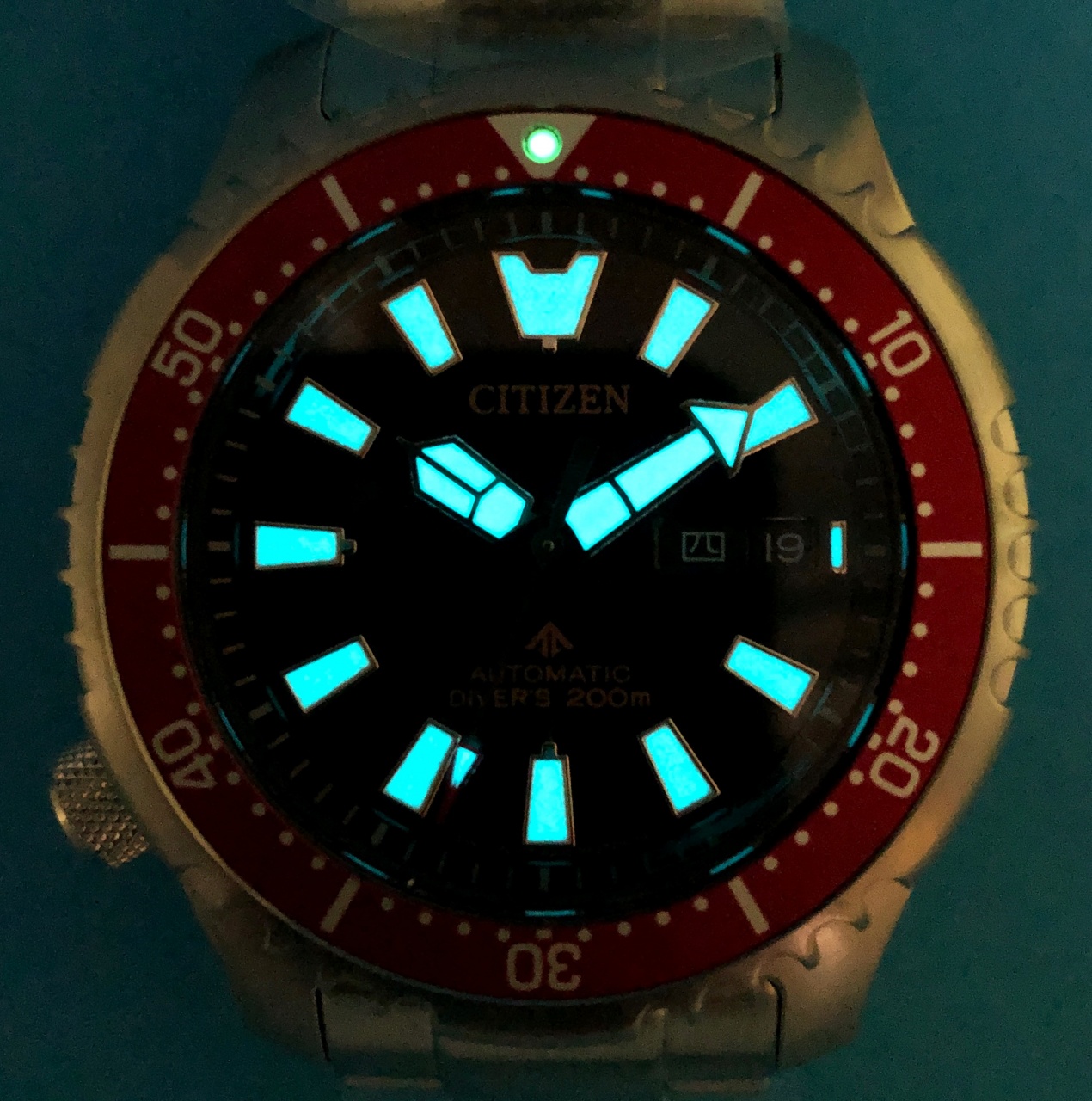 Голубой люм на стрелках и метках, зеленый на точке на безеле.