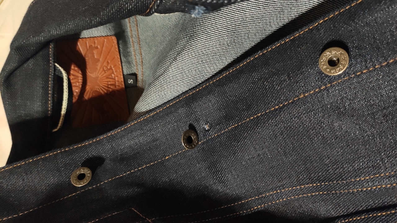 21 унцовый фирменный санфор-деним бушлата отдаёт в серый, т.к. немытый, на фото по сравнению с моей жилеткой IH-526SV. Из пакета деним в меру жесткий - по ощущению такой-же как на моих 634S-21, когда я их из пакета доставал.