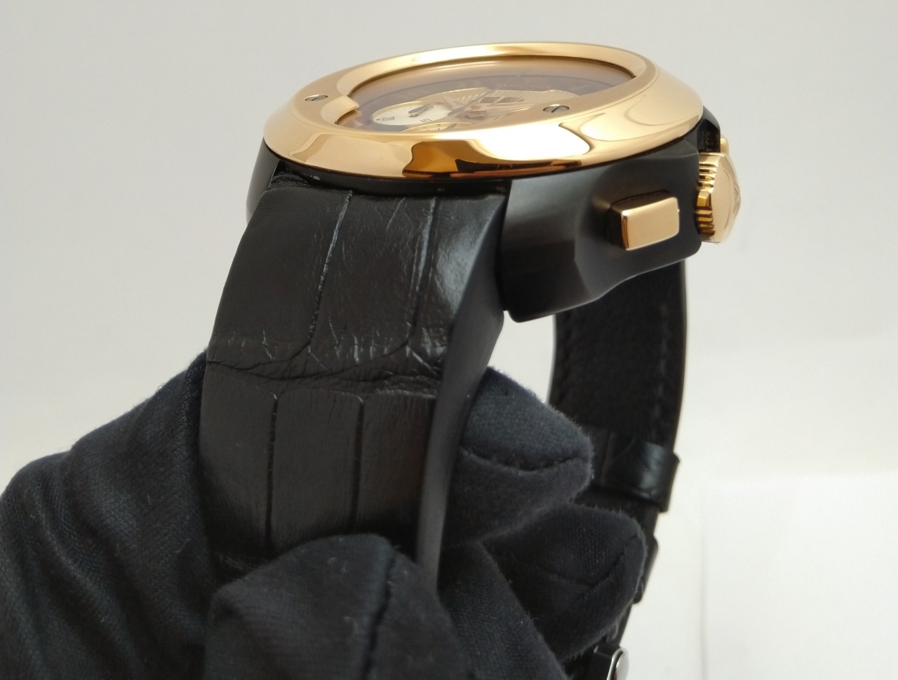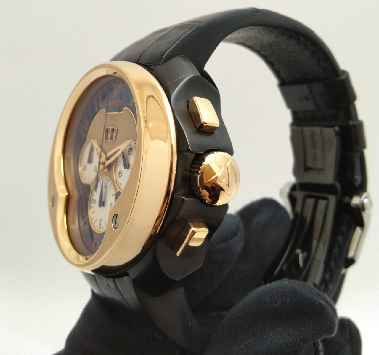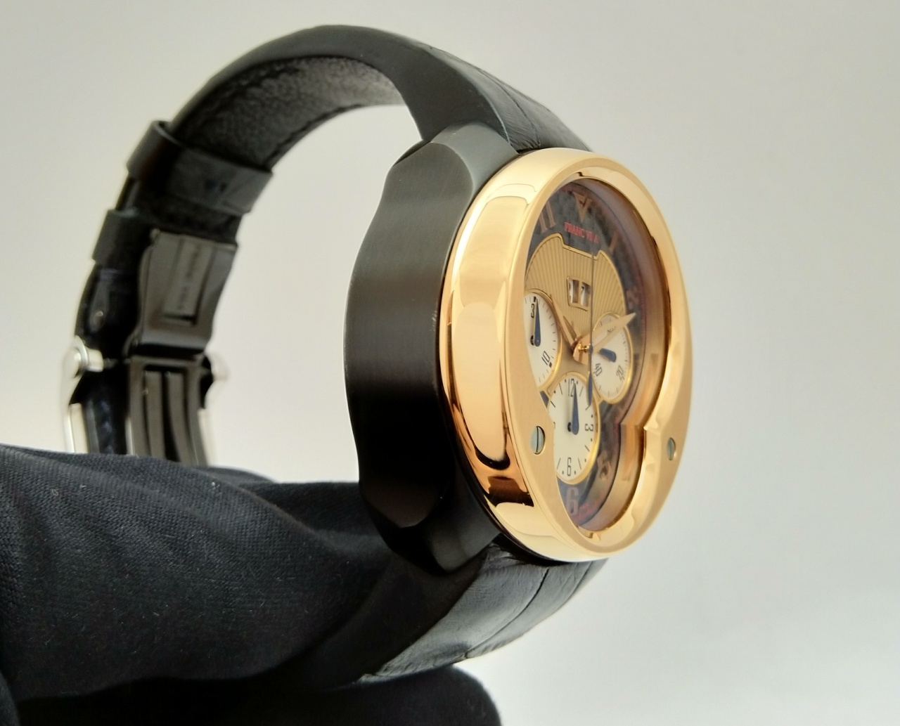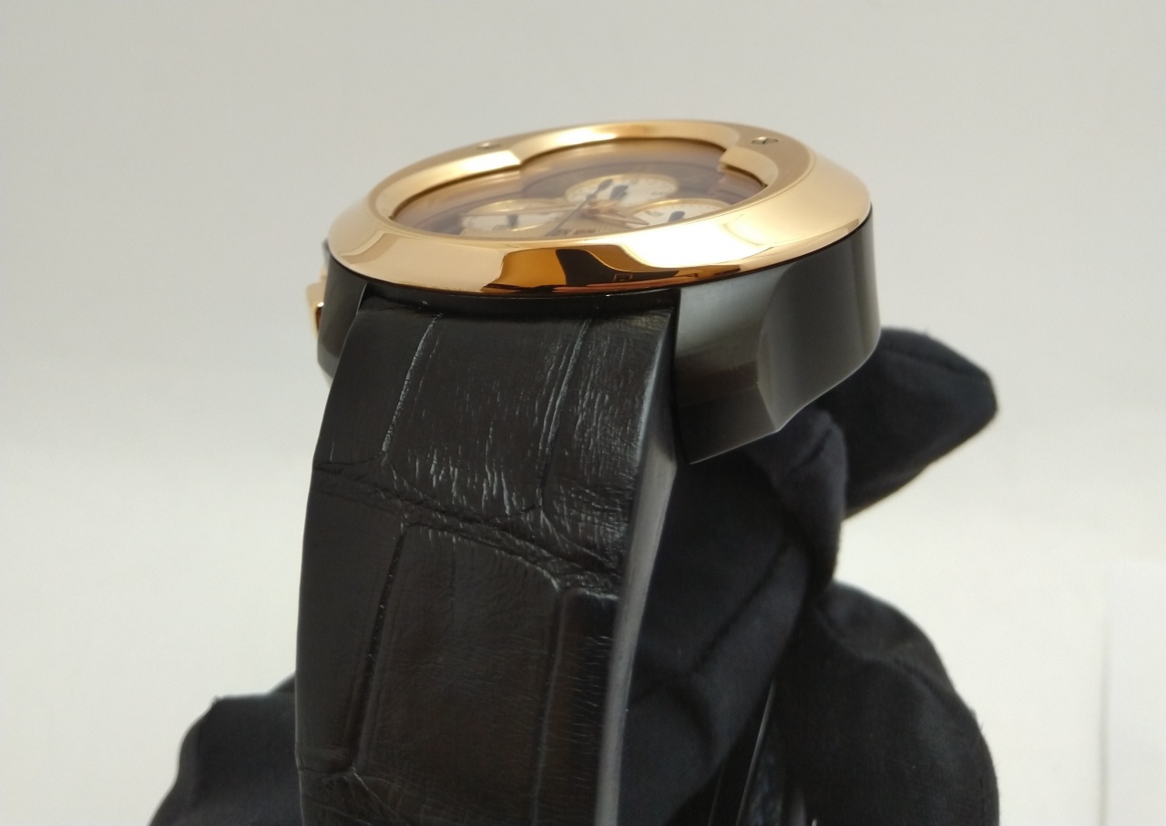 Корпус 46мм, сталь с черным PVD, розовое золото, сапфир.