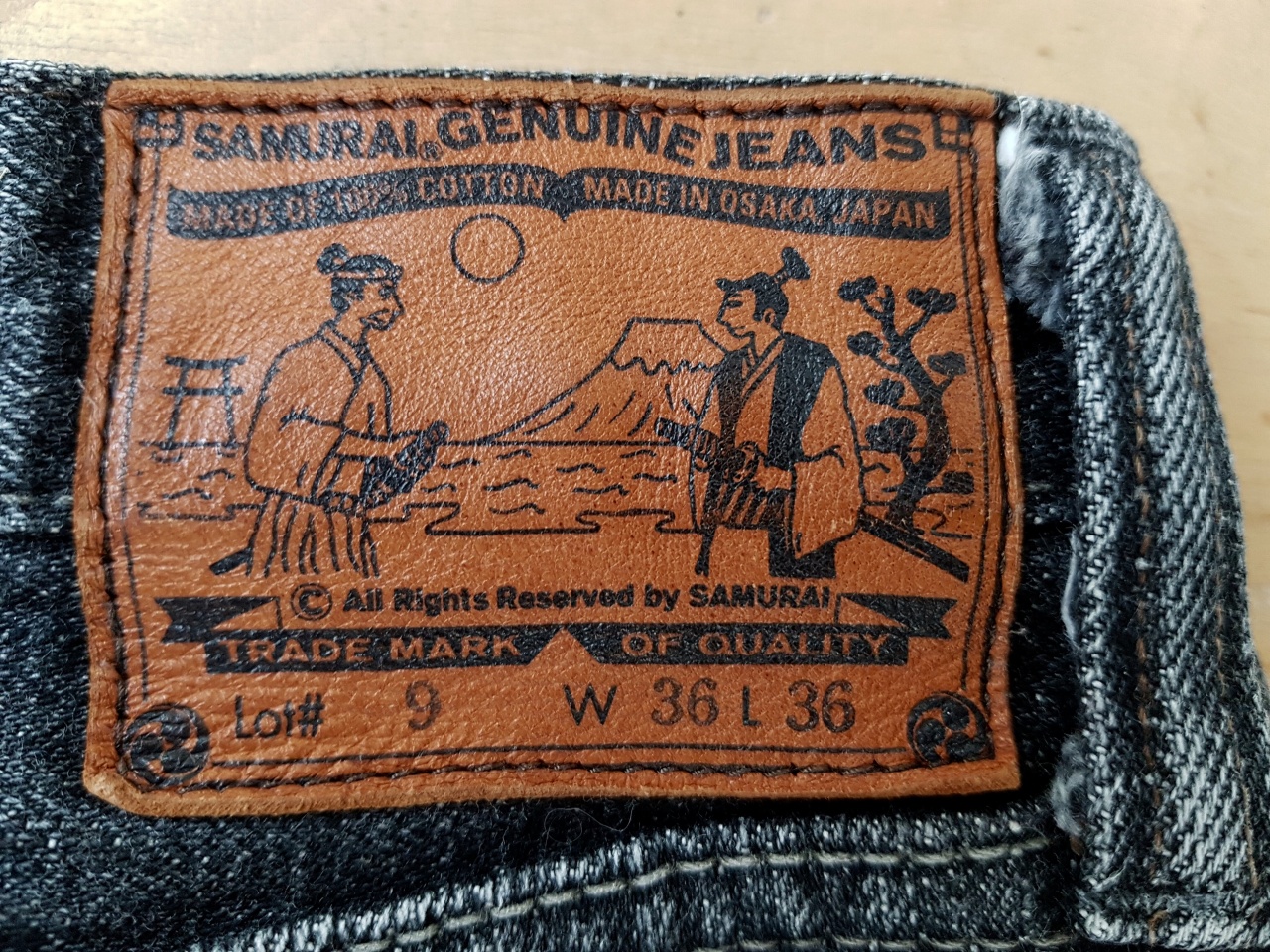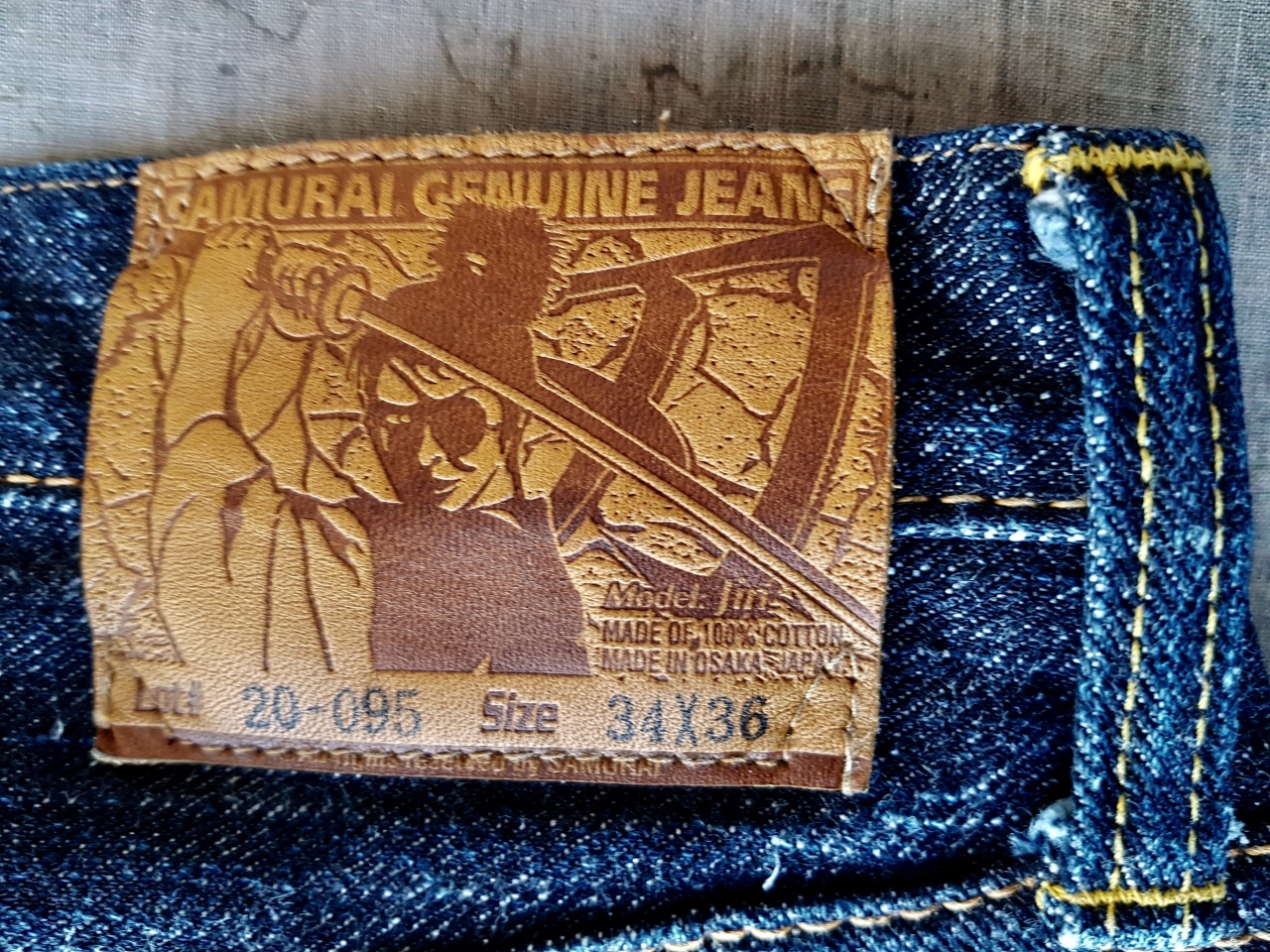 Патч изготовлен из толстой (3-4 мм) кожи. Это необработанная кожа растительного дубления, которая будет красиво стареть и приобретать более тёмный оттенок со временем (вплоть до коричневого). Красивое изменение цвета кожи будет подчёркивать фейдинг этих джинсов, что выглядит очень красиво.