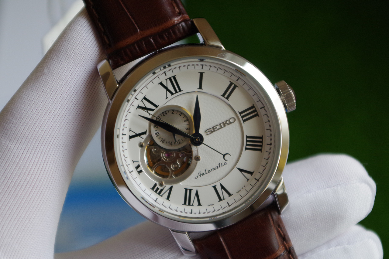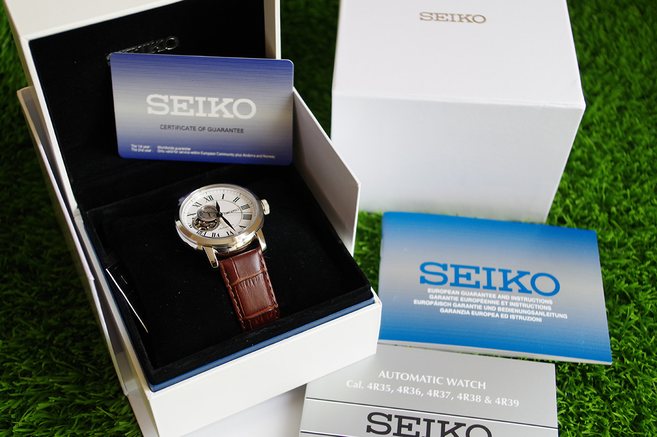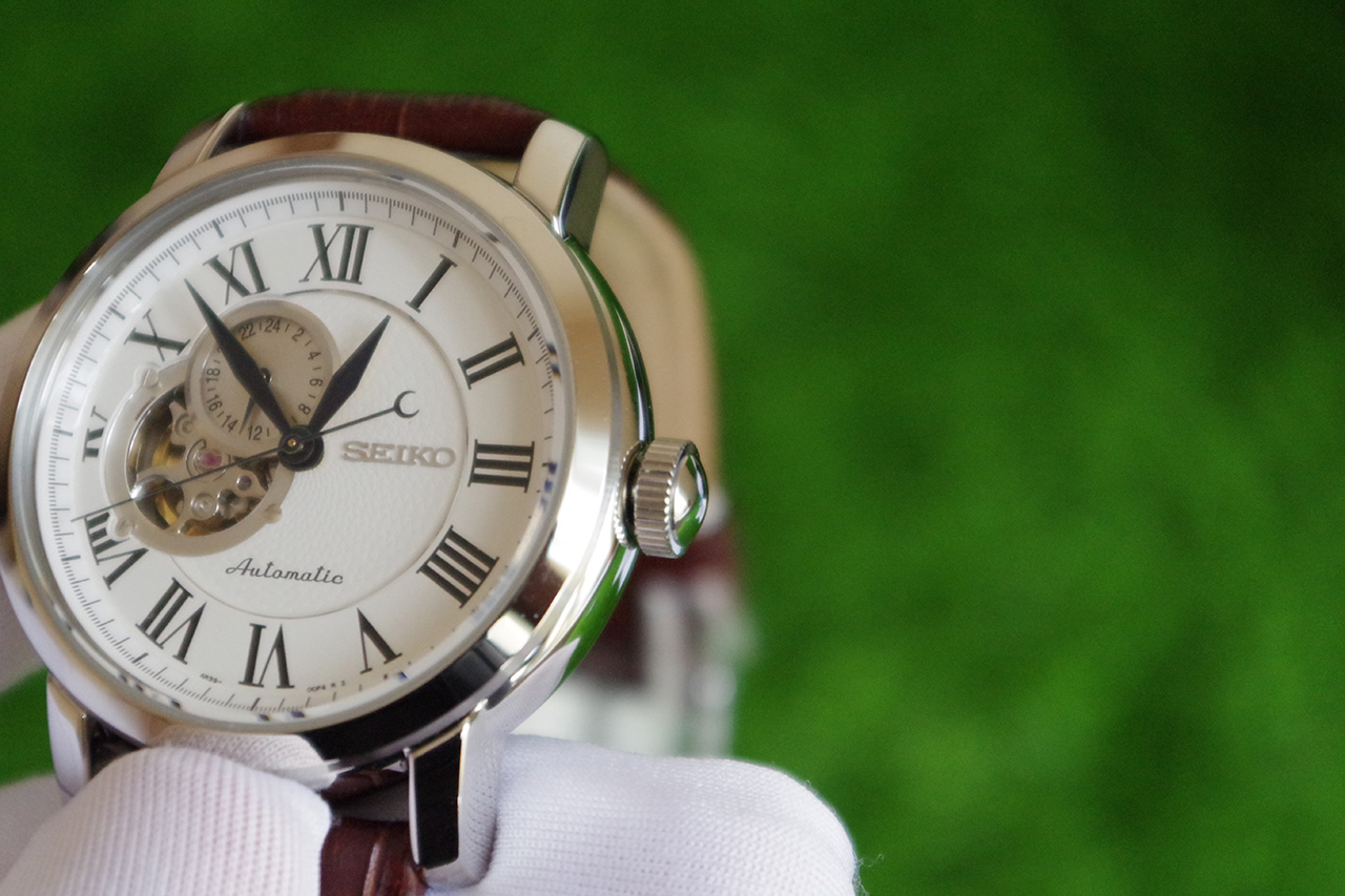 Presage. В механизме 24 камня, частота 21600 полуколебаний в час. Запас хода 41 час. Возможность ручного завода. 12-ти и 24-х часовой формат времени. Сквозь прозрачное окошко на циферблате можно наблюдать за работой механизма часов. Прозрачная задняя крышка.