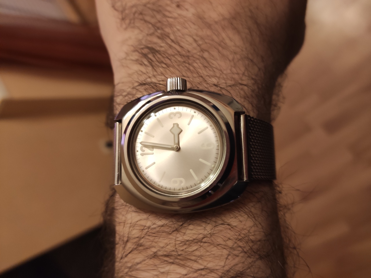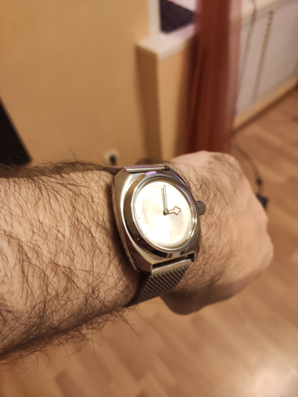 Заказывал цифер и стрелки на ебей у продавца raffles-time. По фоткам выглядел цифер как полностью белый, с подтемненными, но тоже белыми метками. По факту же цвет вообще другой и в зависимости от освещения он белый, металлик и светло серый наверное. Но я в восторге полнейшем. Плюс в мастерской на Дудинке сделали мне двухстрелочник, как я и хотел, причем быстро, прямо при мне. В общем доволен очень часами. Единственное, опять сюда просится ремень, как по мне.