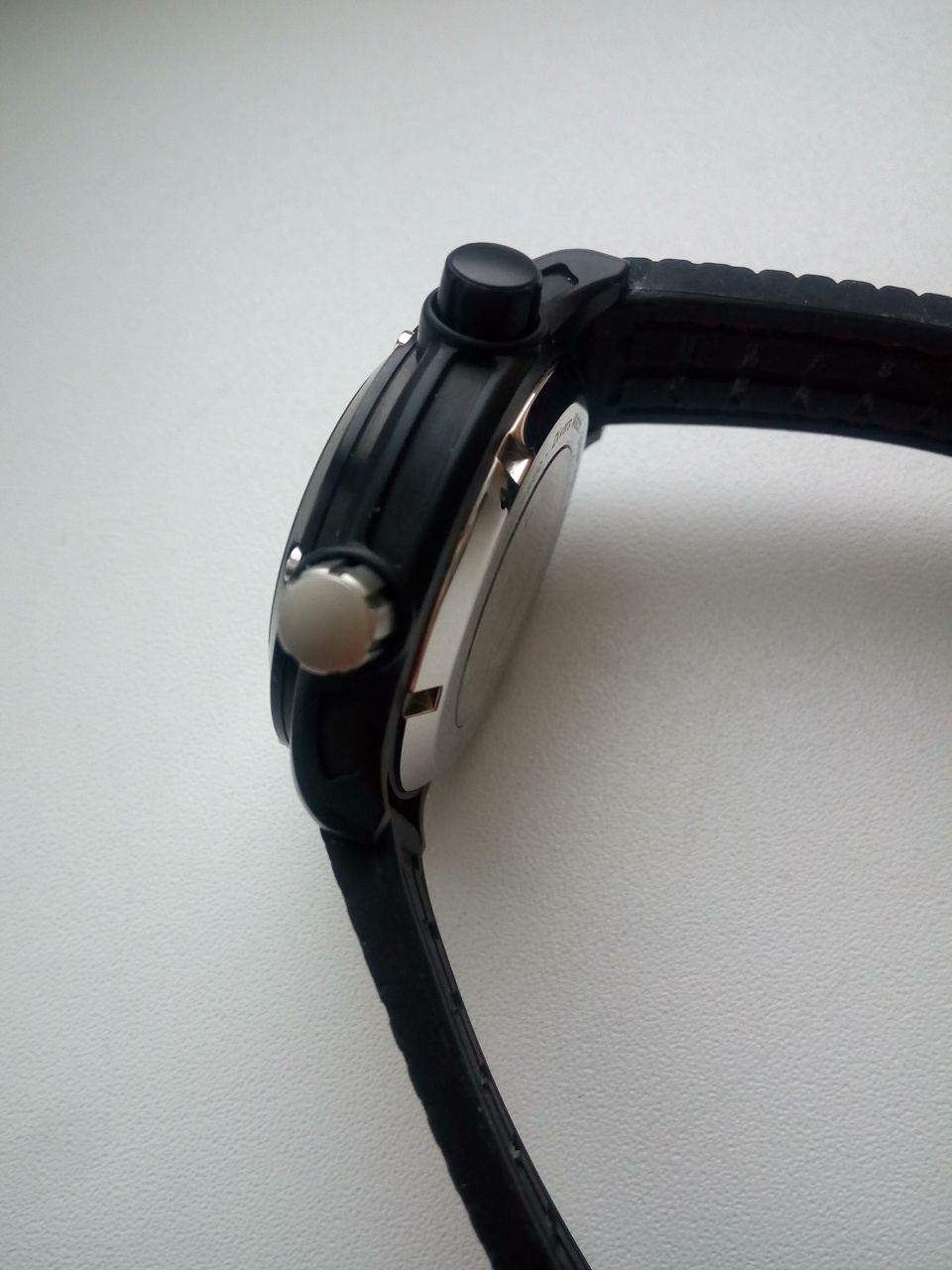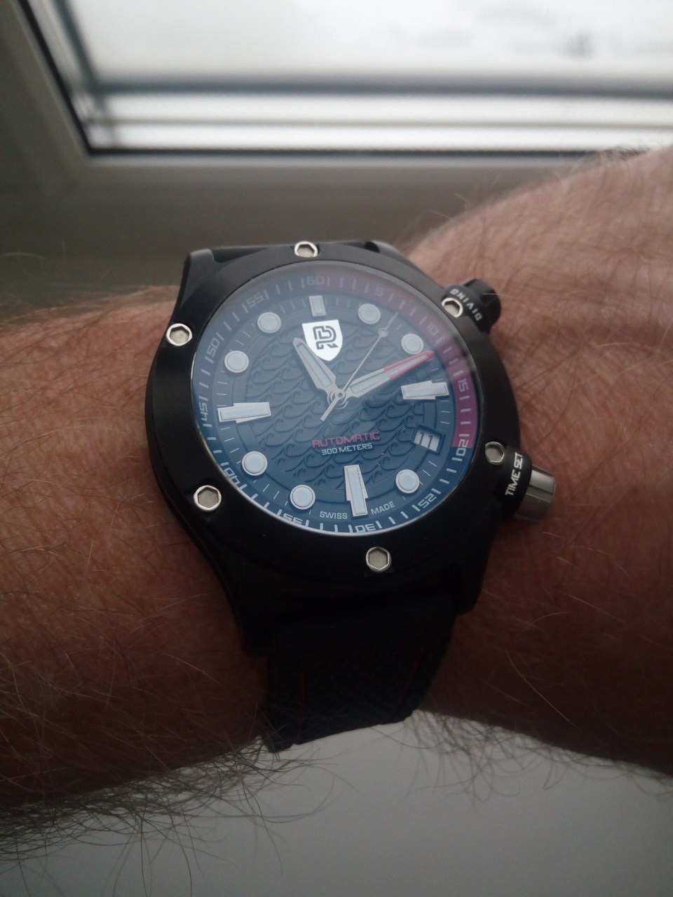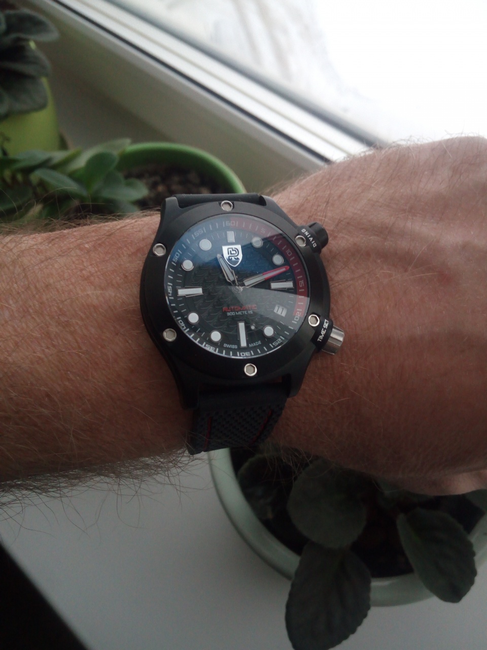 Циферблат: черный с 3D эффектом волн, очень красиво смотрится, накладные метки, дата на 4 часа, внутренний дайверский безель, управляемый головкой на 2 часа, ЗГ на 4 часа, обе головки завинчиваются.