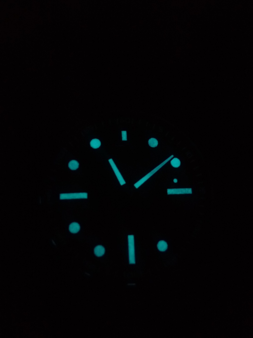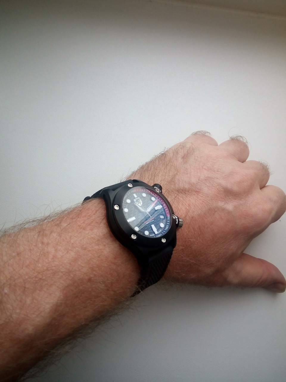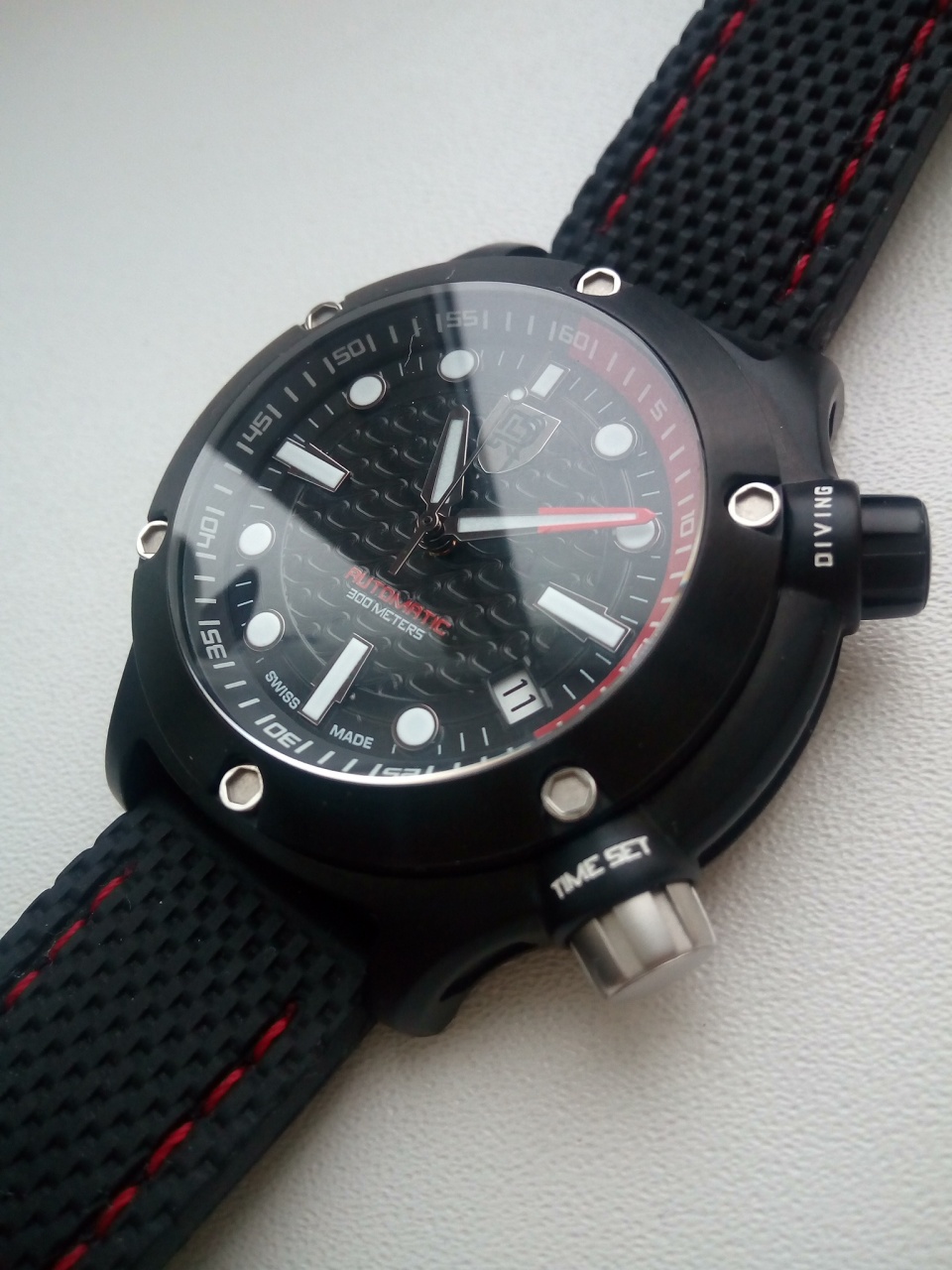 Циферблат: черный с 3D эффектом волн, очень красиво смотрится, накладные метки, дата на 4 часа, внутренний дайверский безель, управляемый головкой на 2 часа, ЗГ на 4 часа, обе головки завинчиваются.