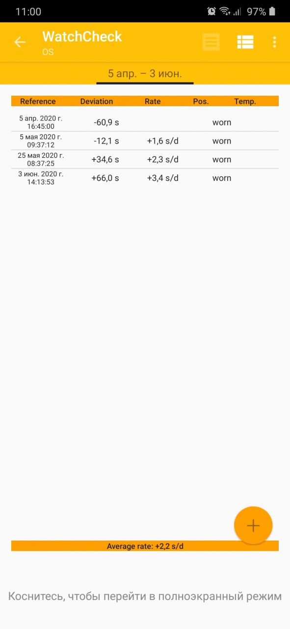 Замерил точность хода в течение 2 месяцев (см. скрин с программки WatchCheck)- средняя в районе +2,2 сек. Первый замер пришелся на режим самоизоляции: неделю часы подзаводились вручную каждые два дня, три недели-минимум движения - за полный рабочий день полный запас хода, по указателю, не восстанавливался. В таком режиме часы обеспечивают макисмальную точность.