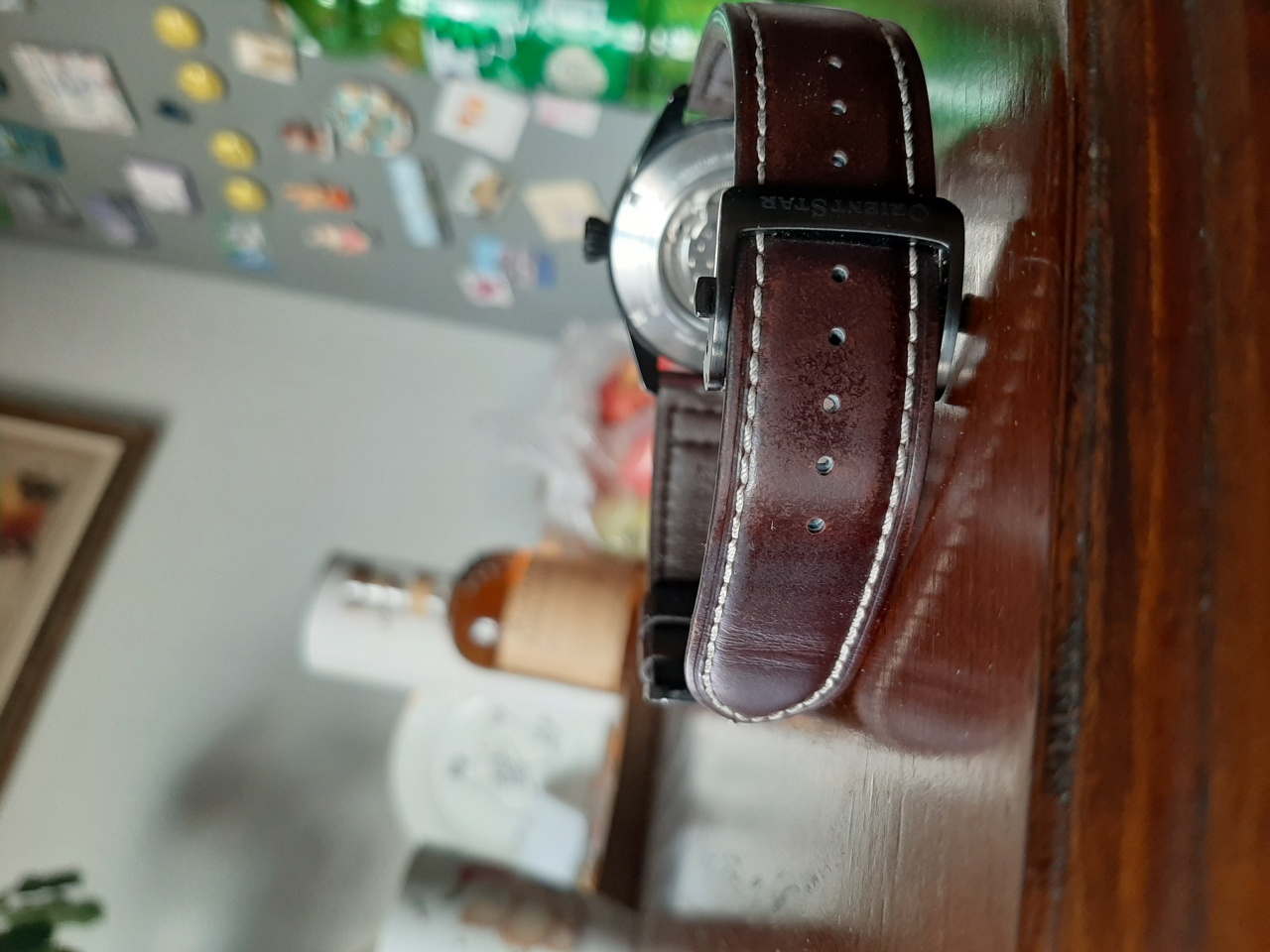 Ремешок сначала казался жестким неудобным, но сейчас, пожалуй, он не плох. Краска с ремешка потихоньку начала облазить, придавая винтажности. Появились небольшие складки. По ощущению, ремешка хватит еще года на два.