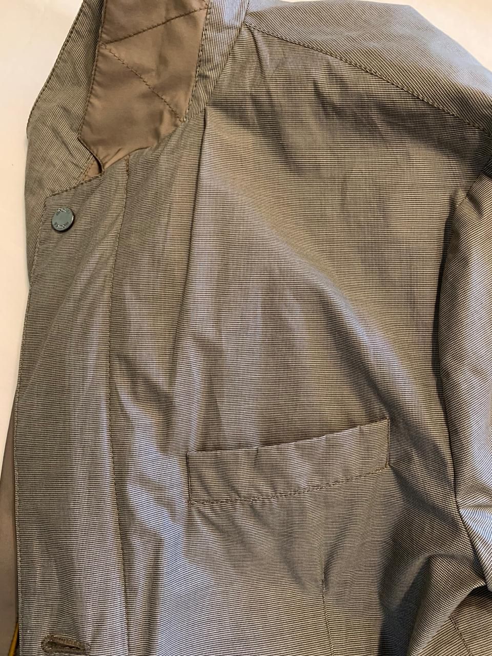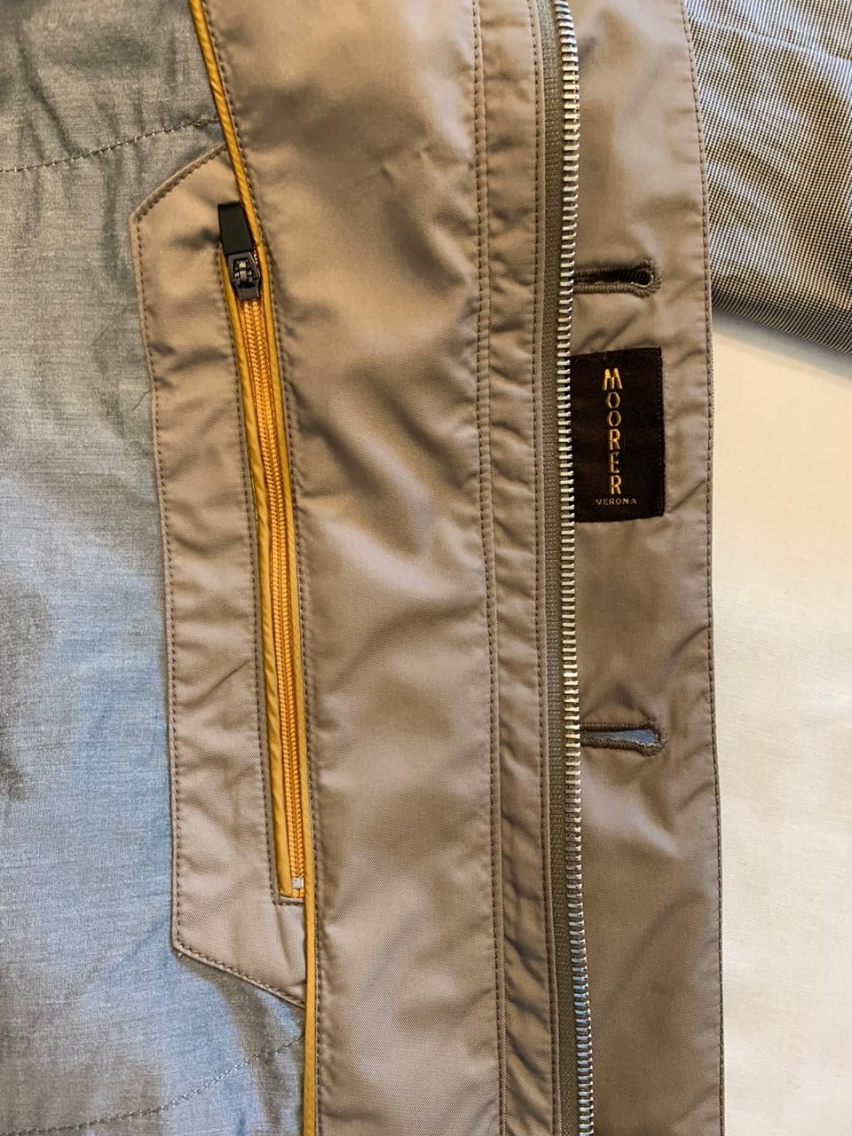Продаётся новая мужская куртка, стилизованная под пиджак, бренда MOORER превосходного исполнения, бежевого цвета, узор в мелкую клетку, однобортная модель, застегивается на молнию и пуговицы с логотипом бренда, два наружных кармана с клапанами, один нагрудный кармашек, два внутренних кармана на молнии, внутри на подкладке, состав: 67% хлопок, 33% шелк, гарантированный 100% оригинал, размер 50(IT), производство Италия.