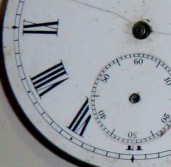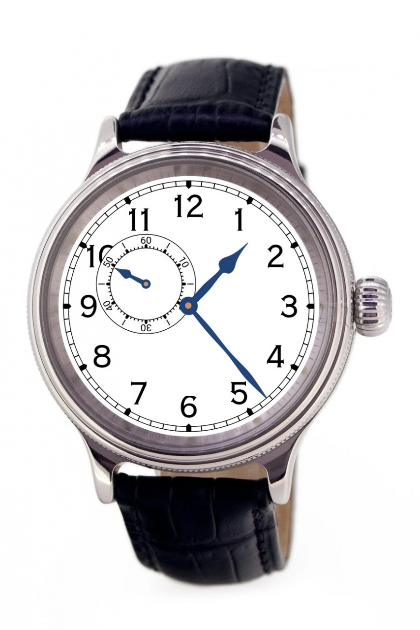 Шкала уже отличается только одной меткой на 12, тот же перевернутый треугольник. Но в этой специфкации регламентировался также крупный размер и начертание цифр и листьевидная форма стрелок, очевидно, поскольку у таких же палубных часов Cortebert они подобны :