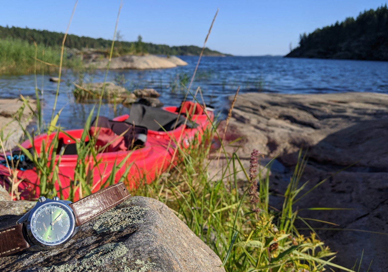 Перед ломкой/колкой сучьев часы снимал с руки только когда дело доходило до настоящей колки (тот случай, когда вибрации от удара топориком становились явно жёсткими). А так… В общем, можно сказать, что они были на руке постоянно. Первые две с половиной недели. Потом, в момент обламывания сучьев с сухой сосны, не выдержала одна из шпилек ремешка и оставшиеся несколько дней часы путешествовали в кармане рюкзака (заводил вручную раз в сутки).