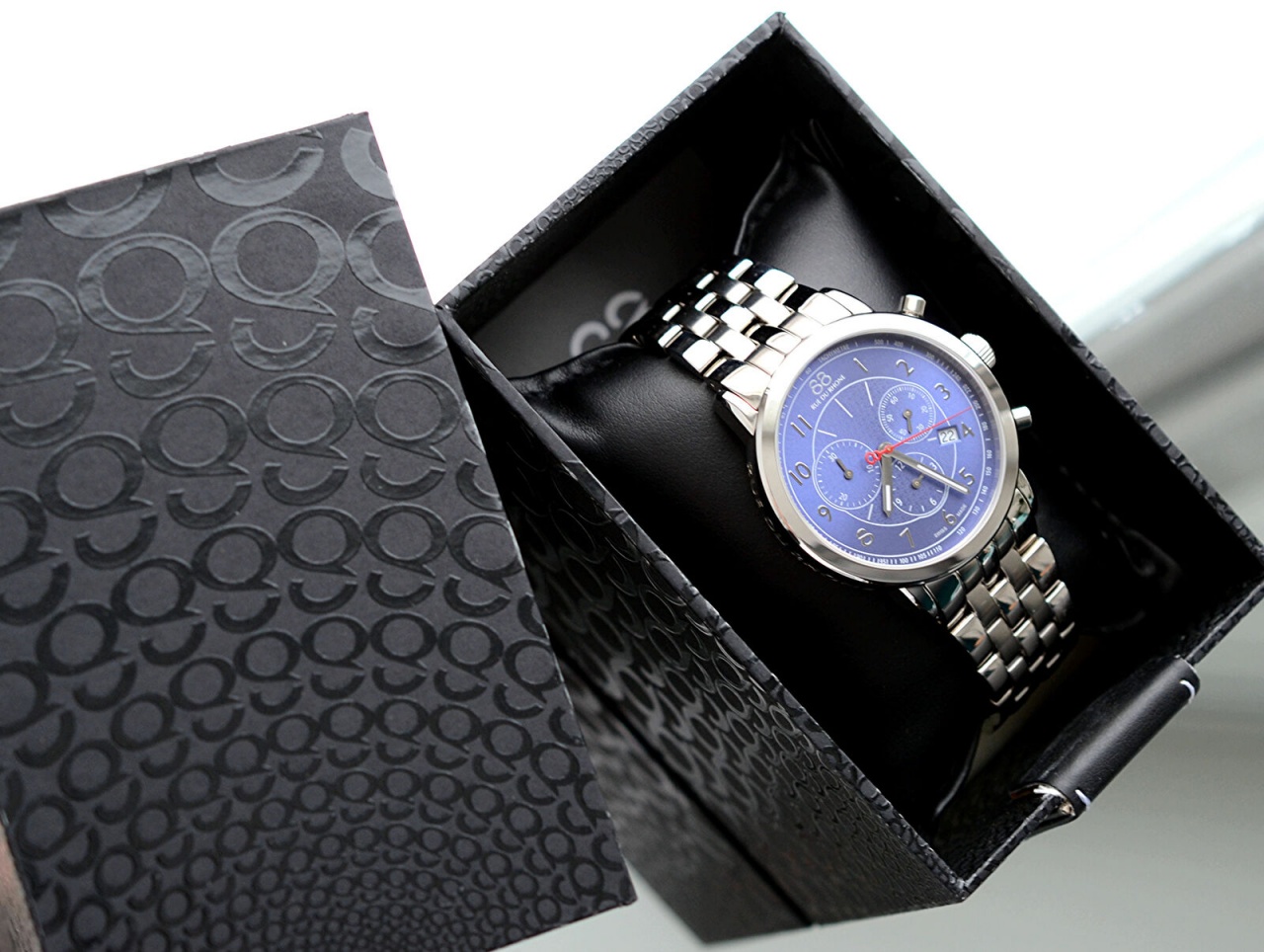 На циферблате расположены счетчики минут, секунд и часов хронографа, маленькая секунда и указатель даты.