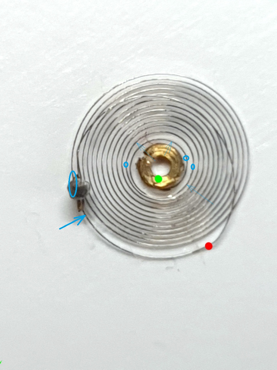 Я означил синими кружками места, где имеются изгибания. Их нужно исправить, держа пинцетом именно в точки, означенные кружками и примерно иголкой давить там, где указано стрелками, в указанную посоку. Ето чтобы поправить концентрчиность. Наверное после етого завиток Бреге придет на месте.
