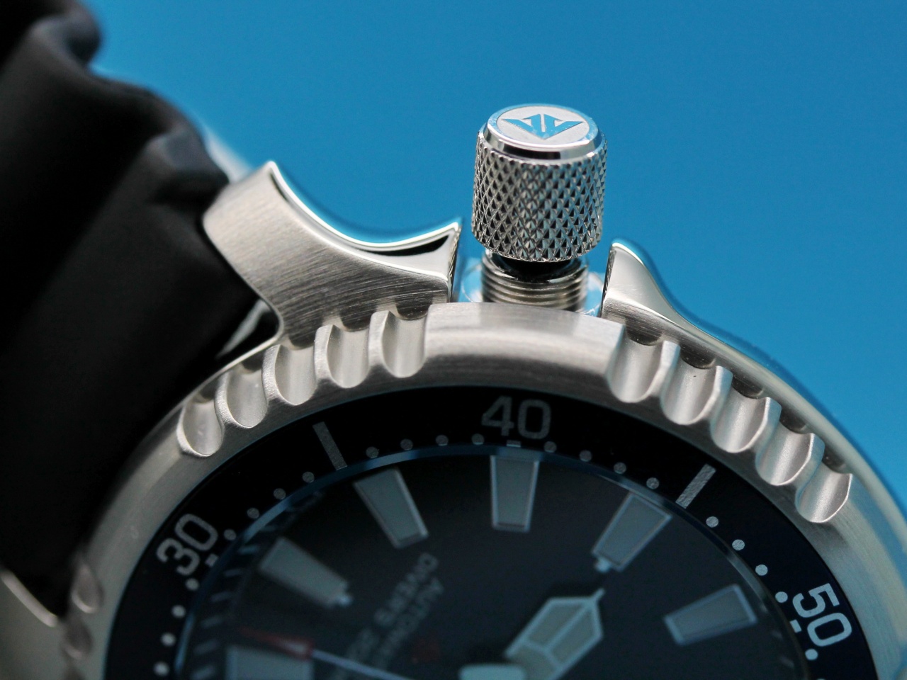 Завинчивающаяся заводная головка на левой стороне, смещенная на 8 часов.