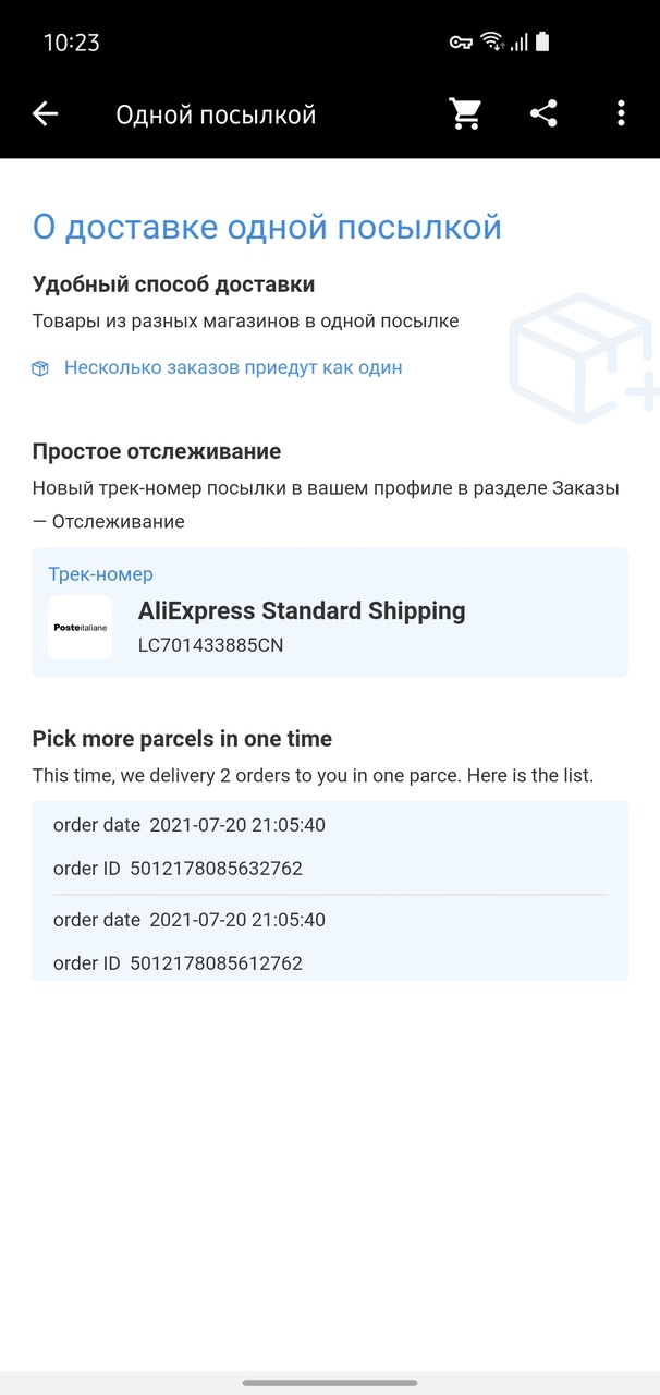 Первый раз я на такое два года назад попал: принёс с почты пакет, открыл — а там посылочки, которые я уже считал потерянными. Теперь али уведомление присылает, что мы вам вот это и вот то объединили.