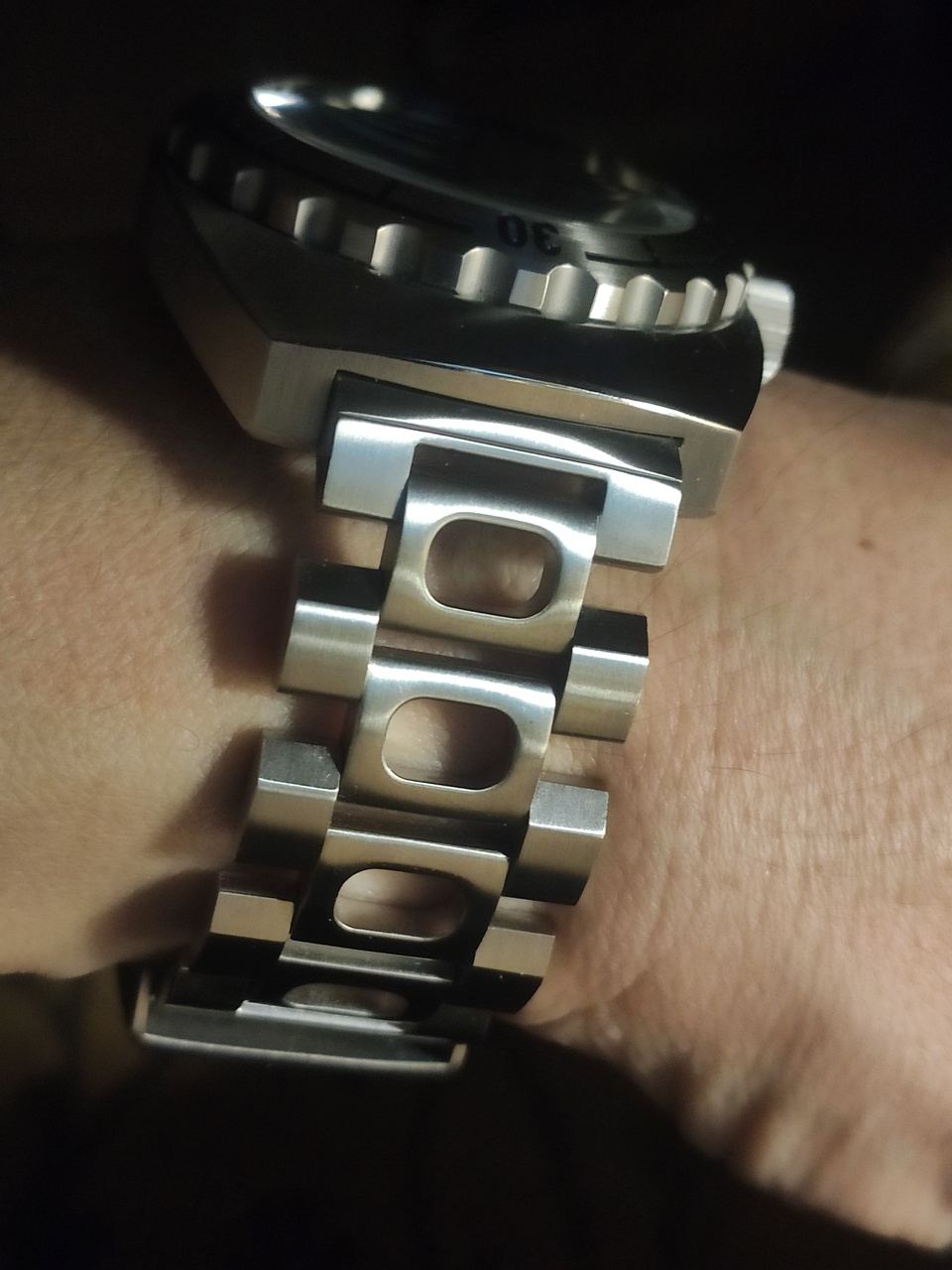 По поводу того, как выглядит браслет - при виде сверху создаётся впечатление некой ущербности из-за того что первое звено скрывается массивным корпусом и его почти не видно. Это звено зафиксировано в корпусе под определенным углом для комфортной посадки на руку. При взгляде сбоку (под углом) браслет выглядит нормально и вполне гармонично с корпусом.