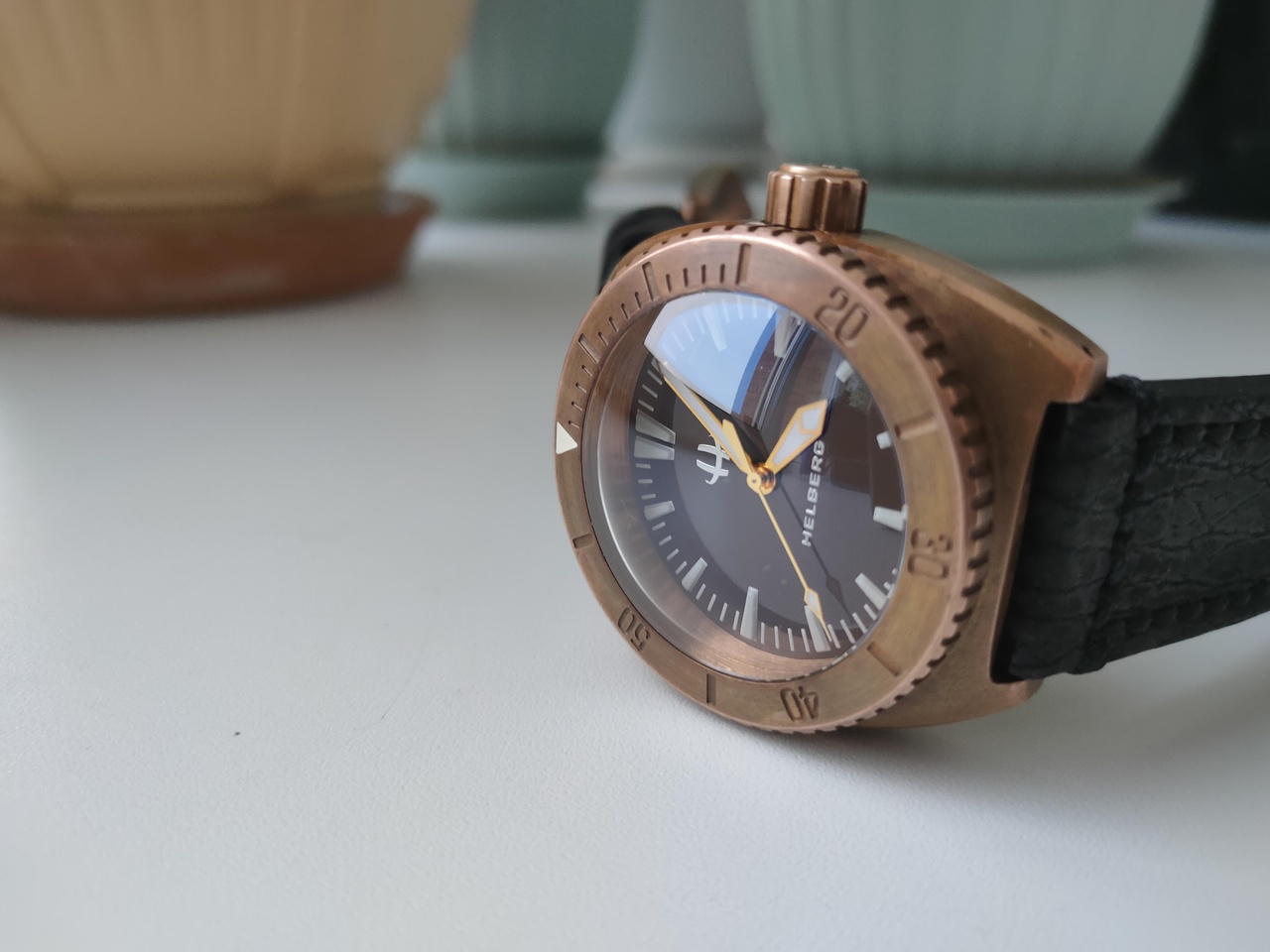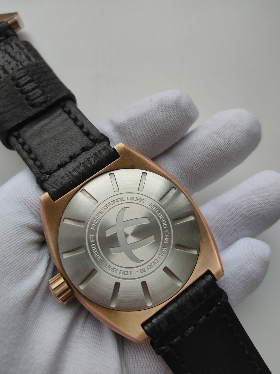 В продаже бронзовая мощь от немецкого производителя - H2O Helberg CH6. Лимитка уже давно распроданная на сайте производителя. В настоящий момент заказать такие часы в бронзовом корпусе невозможно. Модель на форуме известная и довольно популярная. На просторах много отзывов и обзоров про отличное качество исполнения, правильную красивую патину, шикарный купольный сапфир этих моделей. Скажу, что я тоже поддерживаю эти положительные отзывы- часы, правда, очень добротные и впечатления когда берешь их в руки очень даже на уровне