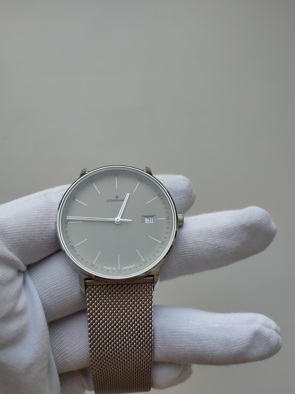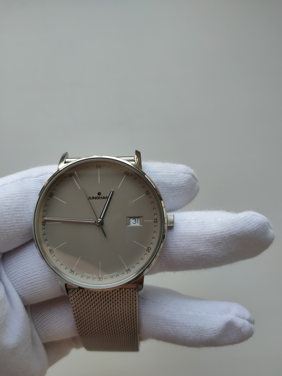 В продаже идеальный образец баухауса от уважаемого немецкого производителя с более чем 150-ти летней историей! В живую часы выглядят намного интереснее чем на фото и приятно удивляют. Отличный миланский браслет, интересный цвет цифера - в зависимости от освещения переливается от серо-болотного до коричнево-молочного. Секундная стрелка практически идеально попадает в метки. Отличный вариант приобрести небанальный кварц с классным дизайном. Из следов носки несколько малозаметных потертостей на застежке и микроцарапок на корпусе. В коробке есть пара потертостей на коже внутри коробки возле подушечки.