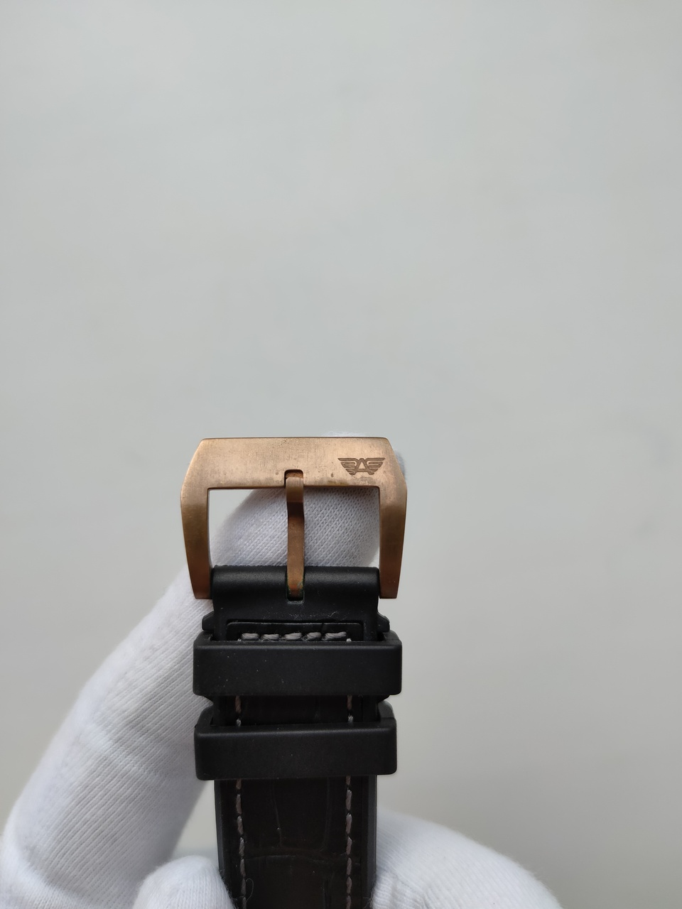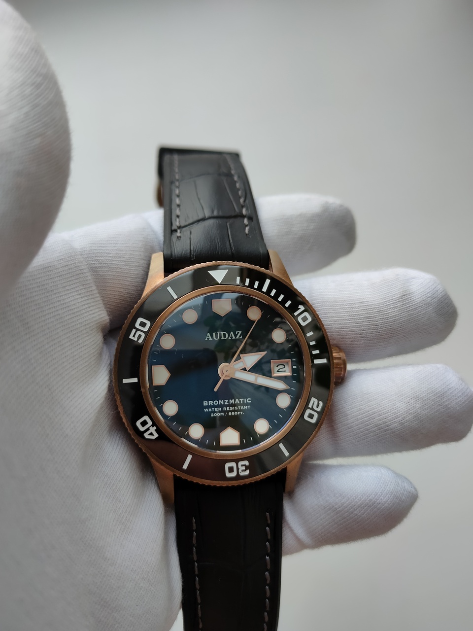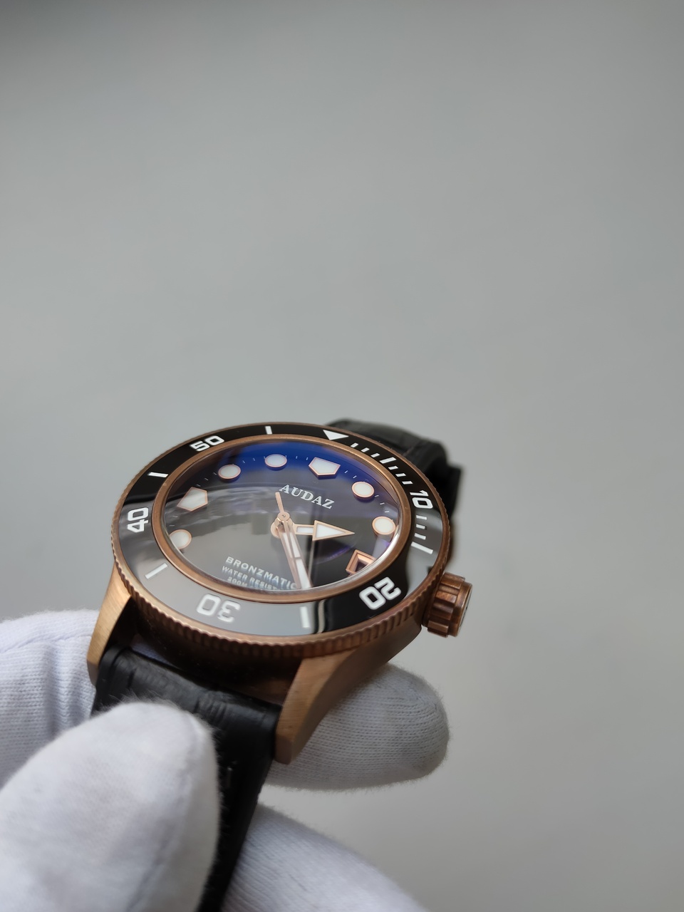 В продаже шикарная и довольно редкая бронза из личной коллекции. Часы в отличном состоянии с минимальными следами носки и на уверенном ходу. Цифер - черный как ночь, с крупными накладными метками, идеально гармонирует с бронзовым корпусом. Керамический поворотный безель. Классный яркий люм. Под капотом надежный и проверенный временем NH35A от Seiko. Родной ремень комбинированный (каучук снизу с кожаной прошитой вставкой сверху) в отличном состоянии. В комплекте родной тревэл-кейс для переноски часов.