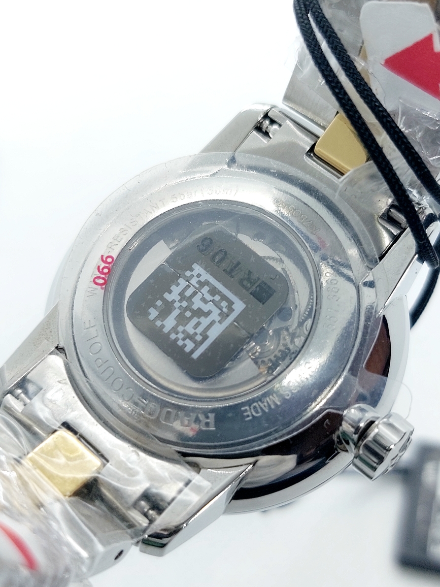 Прозрачная задняя крышка корпуса изготовлена из сапфира, сквозь которую виден механизм и по краю нанесена информация.