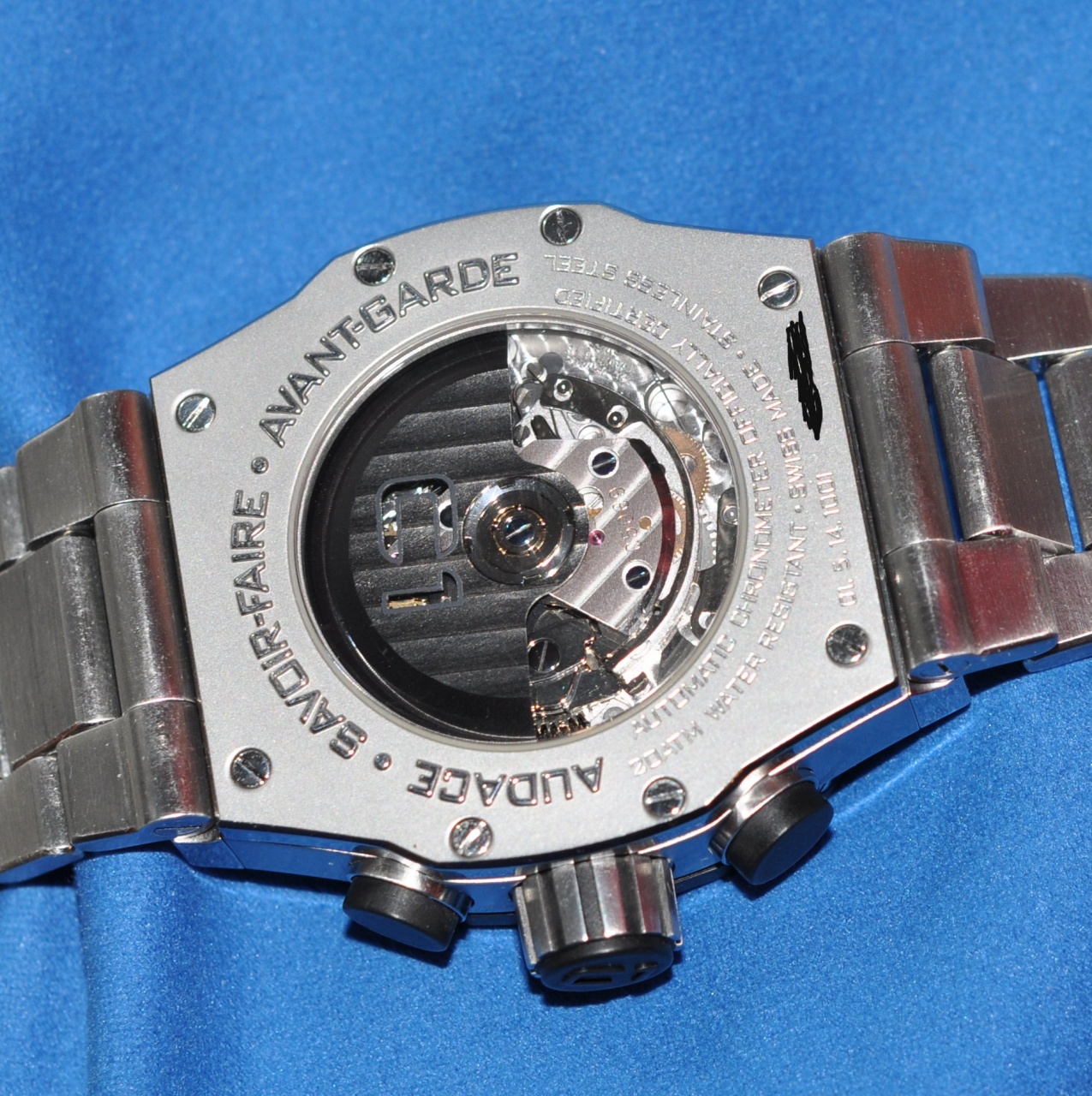 Размер корпуса получился достаточно приемлемый 44мм в диаметре и 16мм в толщину. В отличие от концептов, новинка имеет приличную водозащиту 20 АТМ. И вполне обоснованной выглядит надпись на корпусе этих часов Audacity - Know-How - Avant-garde (Смелость - Технологии - Лидерство [перевод литературный). Хронограф Соглашения C1, COSC-гарантированное устройство хронометрирования, создан в духе продвинутого технологического исследования и новшества. The Concord C1 Chronograph, COSC-certified timekeeping device, is created in the spirit of advanced technological research and innovation.