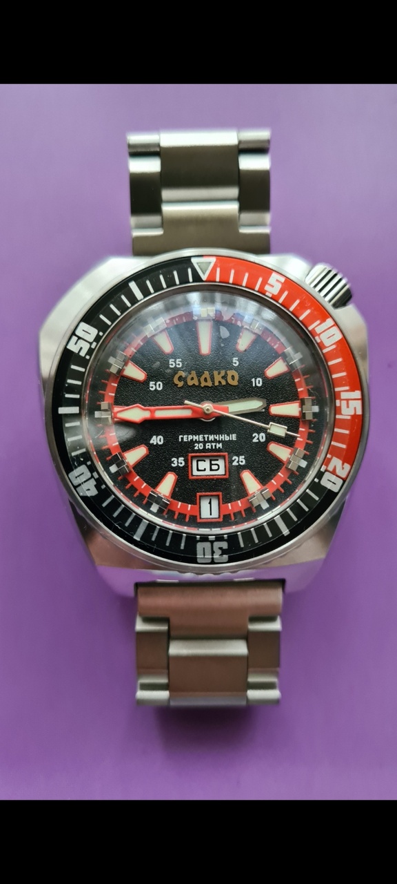 Современную версию Садко модернизировали. Повысив водозащиту, добавили гелиевый клапан и кнопку быстрой корректировки даты. Клапан расположен в районе цифры 8, а кнопка корректировки даты в верхней части корпуса у цифры 1. Попробовал нажимать. Щелчки мягкие, дата переводится хорошо: