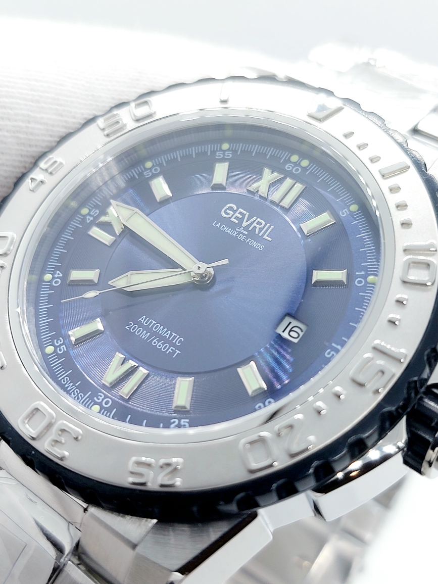 Синий циферблат с серебристыми мечевидными стрелками залиты светонакопительным составом светло-зеленого цвета.