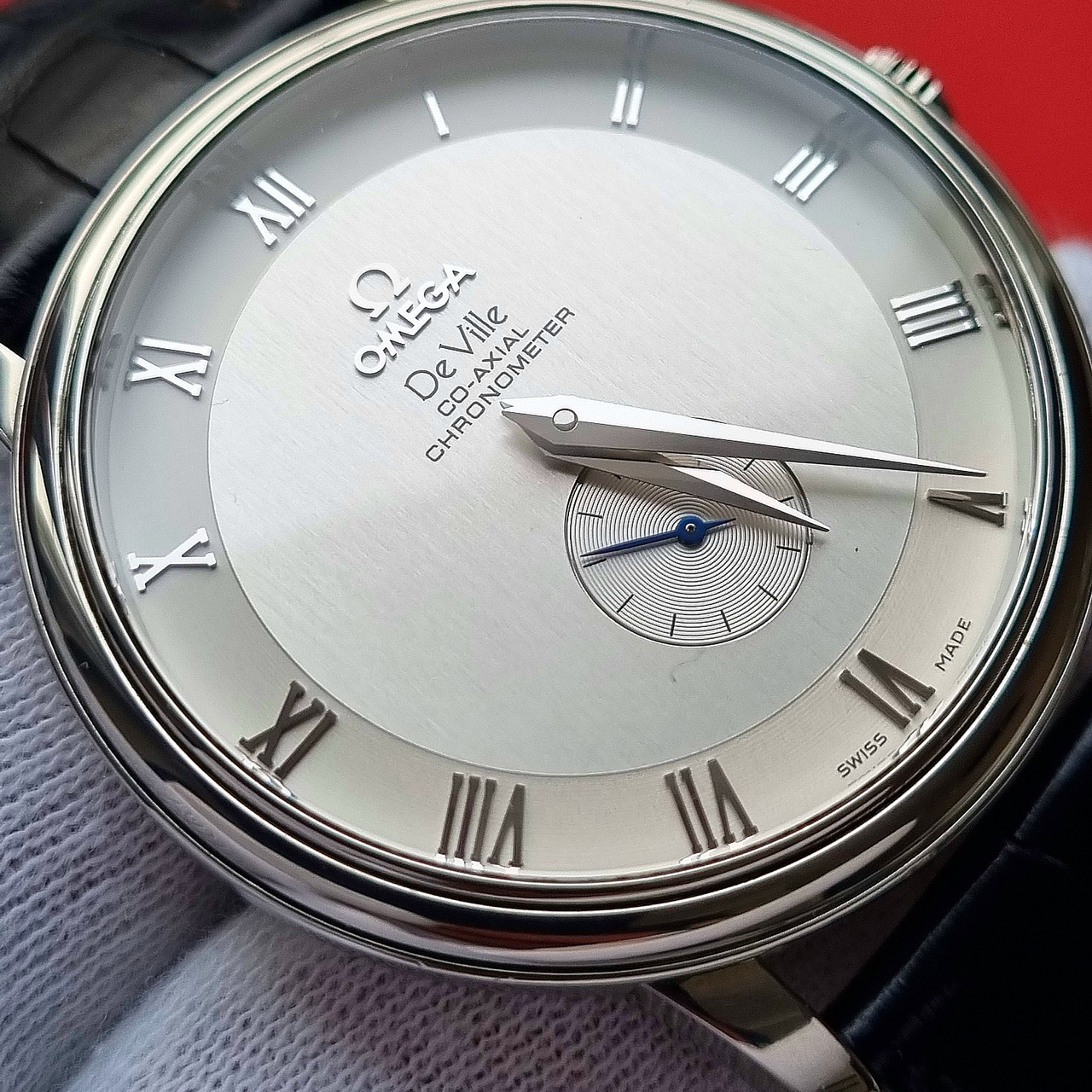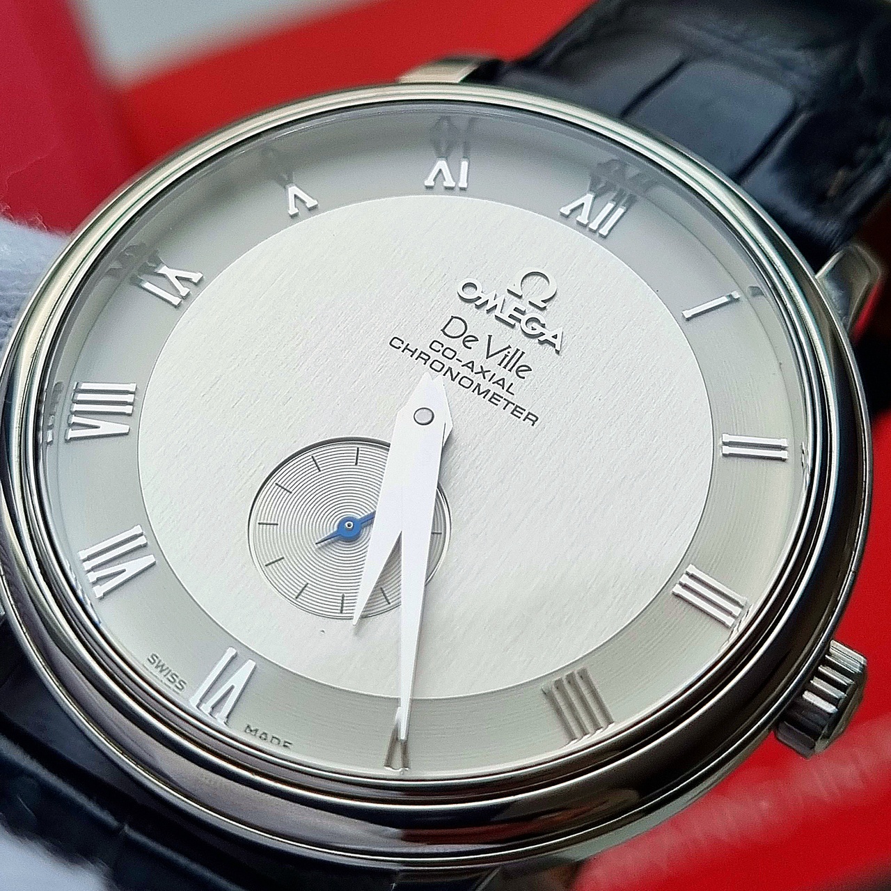 Отличный коаксиальный костюмник от Омеги в правильном 39 размере. Нетленная классика. Ничего лишнего вкупе со 100% узнаваемостью. Красивый двухзонный циферблат, меняющий цвет внутреннего контура от молочно-белого до темно серого- постарался на фото отразить. Вынесенный на 6 часов накопитель с вороненой секундной стрелкой. На знаменитом надежнейшем коаксильном калибре 2500. Полный комплект, куплены 25.10.2017г в Цюрихе. Родной ремень. Имеют естественные следы носки, ничего критичного, по желанию- полировка в подарок.